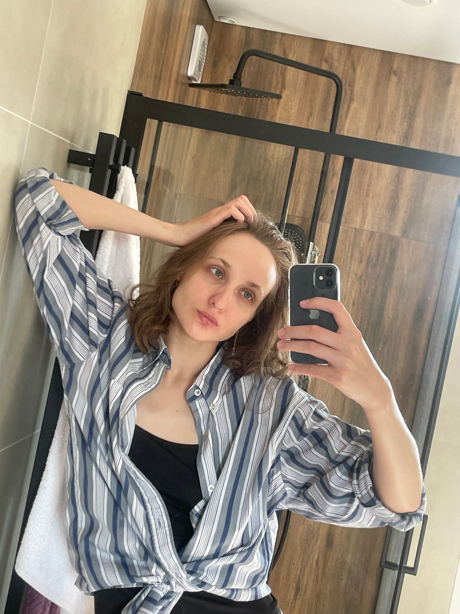 A woman is captured in a mirror selfie, lying in a relaxed pose, likely on a lounge chair or bench, within what appears to be a modern bathroom or spa setting. She holds a dark-colored iPhone with a c…read more