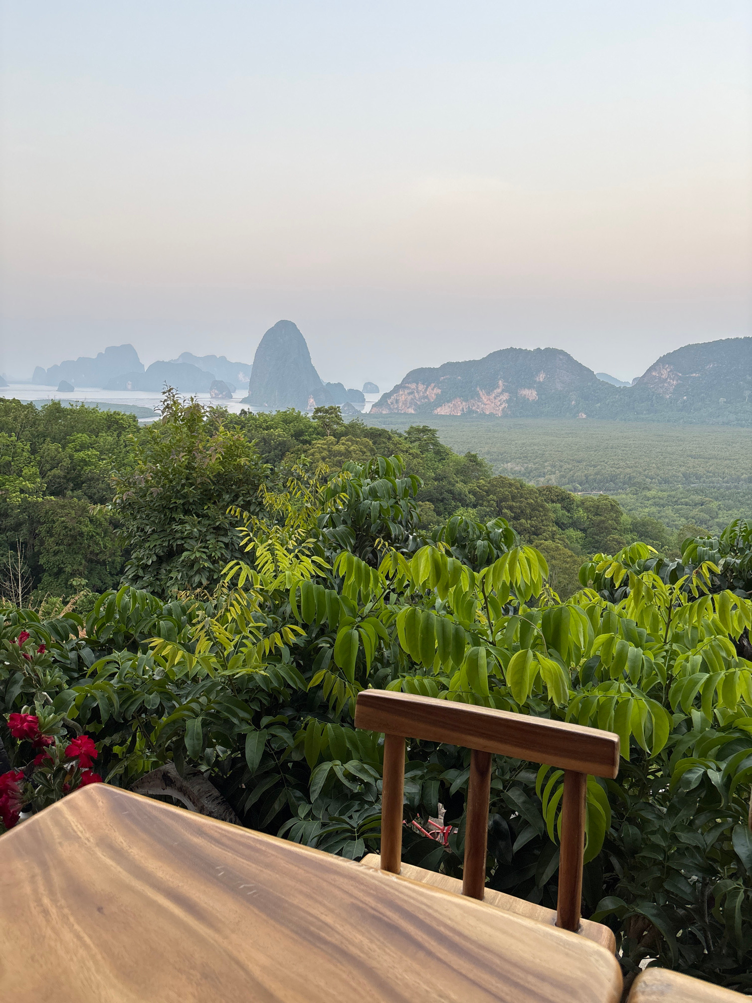 This is an outdoor landscape scene likely taken from a high vantage point, possibly a balcony or terrace. The location appears to be Khlong Khian, Thailand, based on the distinctive limestone karst fo…read more