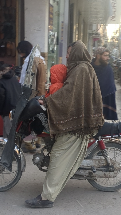 The image depicts a street scene in Quetta City Tehsil, Pakistan, under daylight conditions. In the foreground, a male individual is seated on a red Honda CD 70 motorcycle, balancing with his right fo…read more