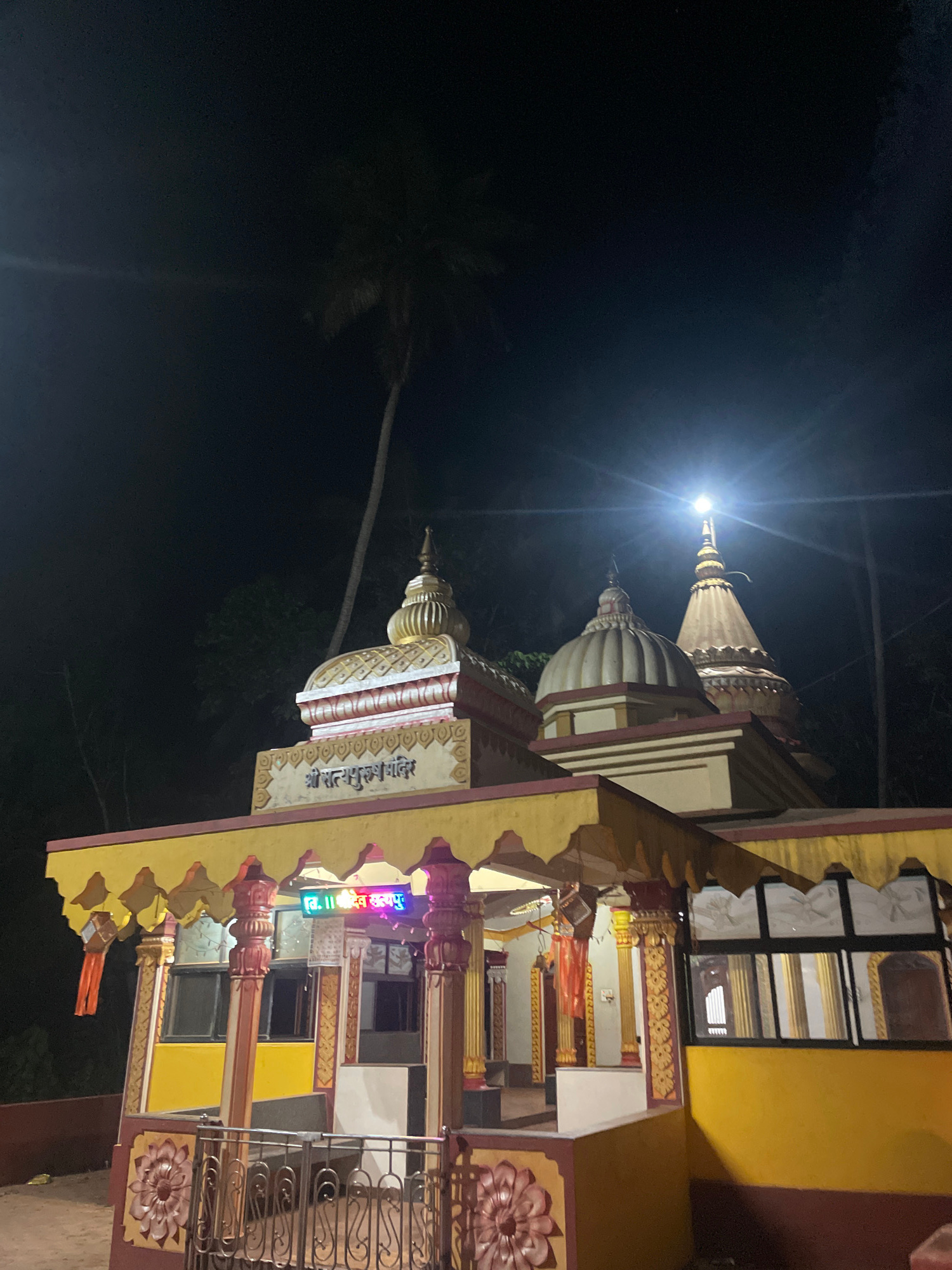 The image shows a Hindu temple at night in Redi, India. The temple is brightly lit with a spotlight illuminating its spires. The building has multiple tiers and levels, decorated with ornate carvings…read more