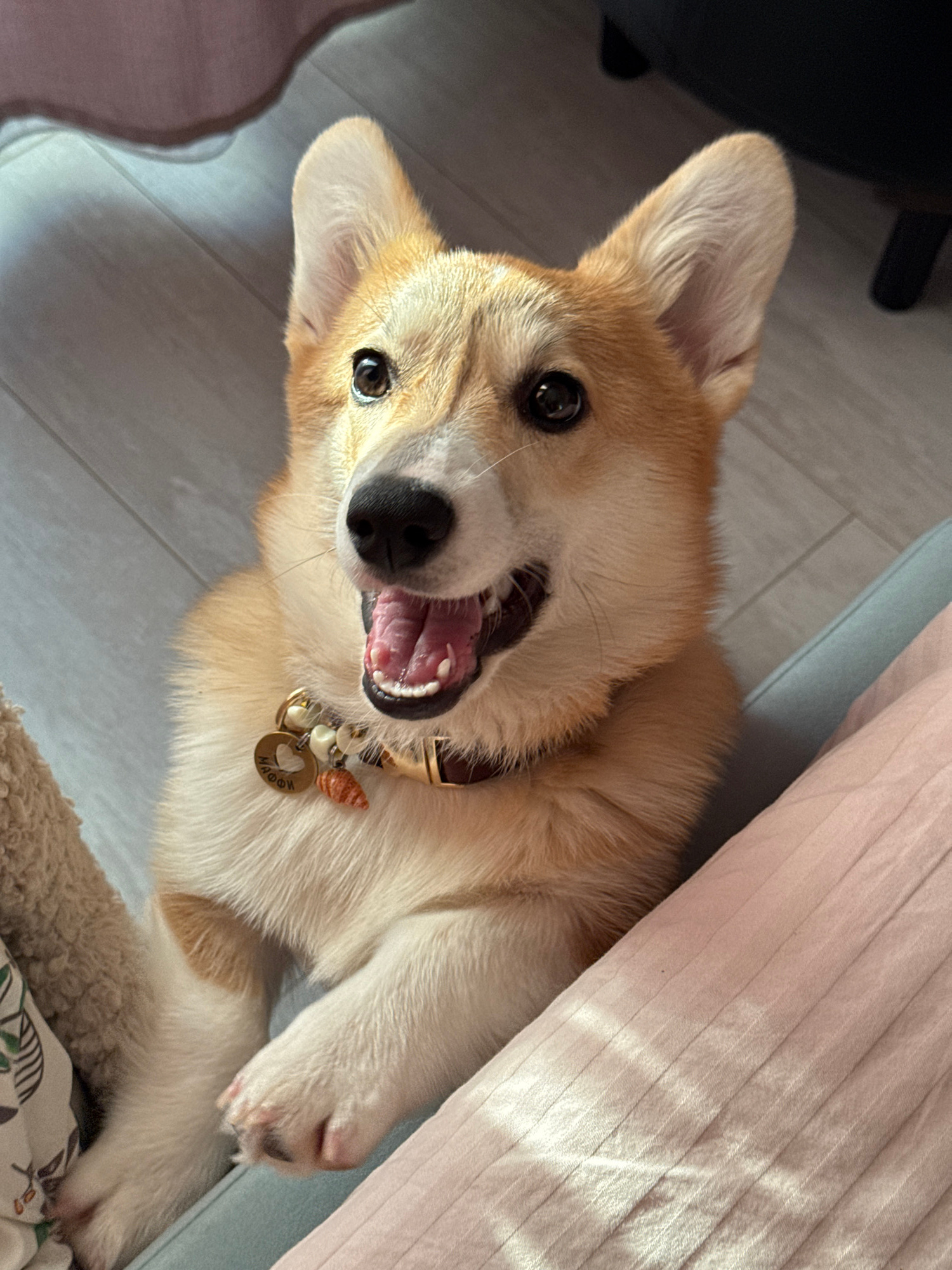 A tan and white Corgi dog is lying on its back on a light-colored tile floor. The dog has a brown collar with a round tag. A light pink blanket or sheet is visible to the right of the dog.