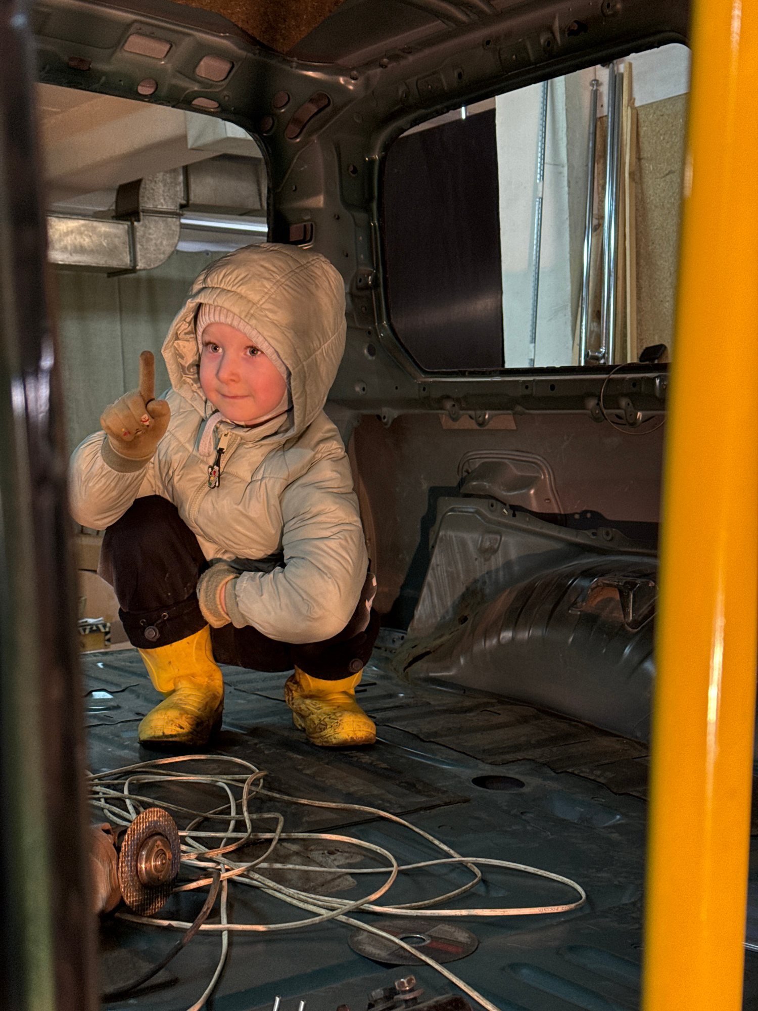 A child in a hooded jacket and yellow boots is crouched inside the stripped interior of a vehicle, possibly undergoing restoration. The location is likely a garage or workshop in Perm, Russia. The int…read more