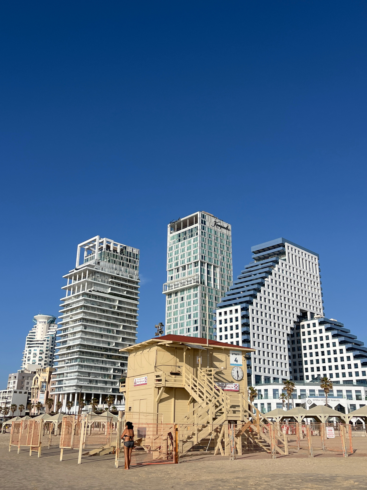The image captures a beachfront scene in Tel Aviv, Israel, with modern buildings and a lifeguard station. The sky is bright blue, contrasting with the white and gray architecture of the buildings. A l…read more