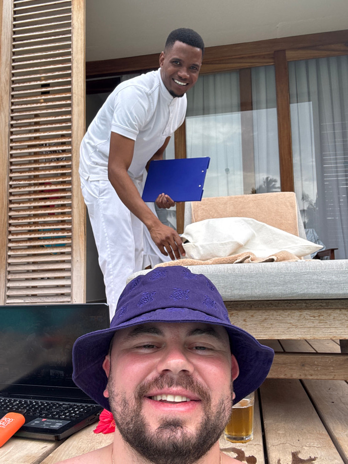 This image depicts two adult males on a wooden outdoor patio or balcony, likely at a resort in Zanzibar, Tanzania. In the foreground, a Caucasian male with a beard and mustache, wearing a purple buck…read more