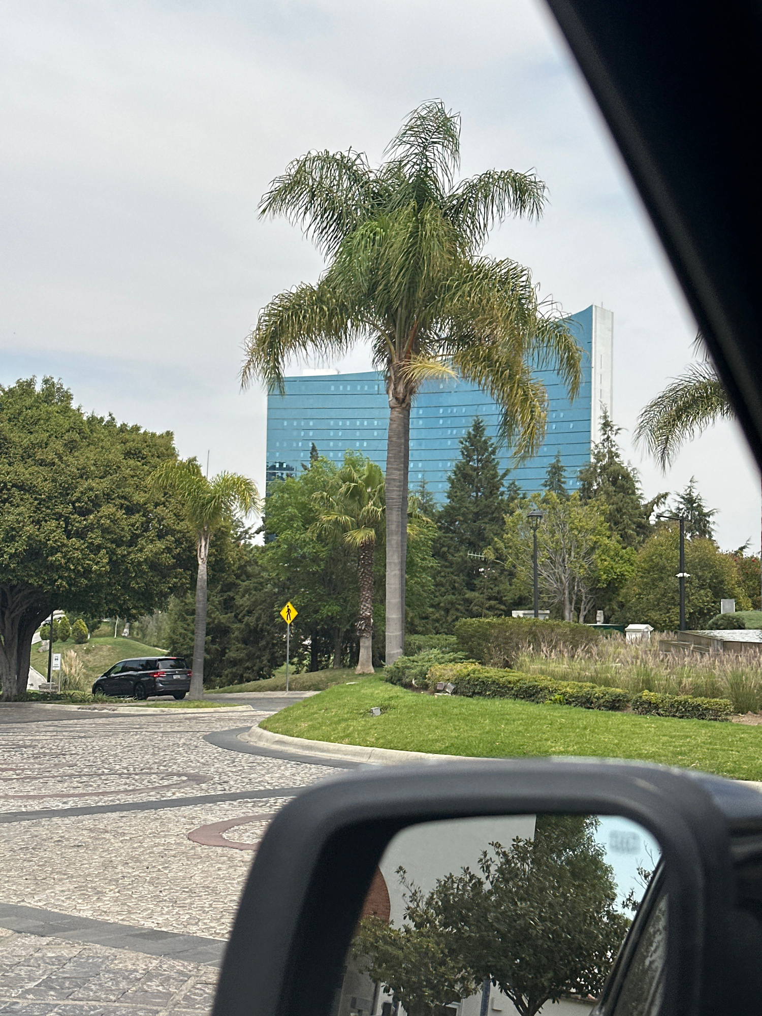 A view from inside a car, the scene captures an exterior landscape. A tall, modern, blue-glassed building stands as a prominent feature, visible through the car window, possibly a large office buildin…read more