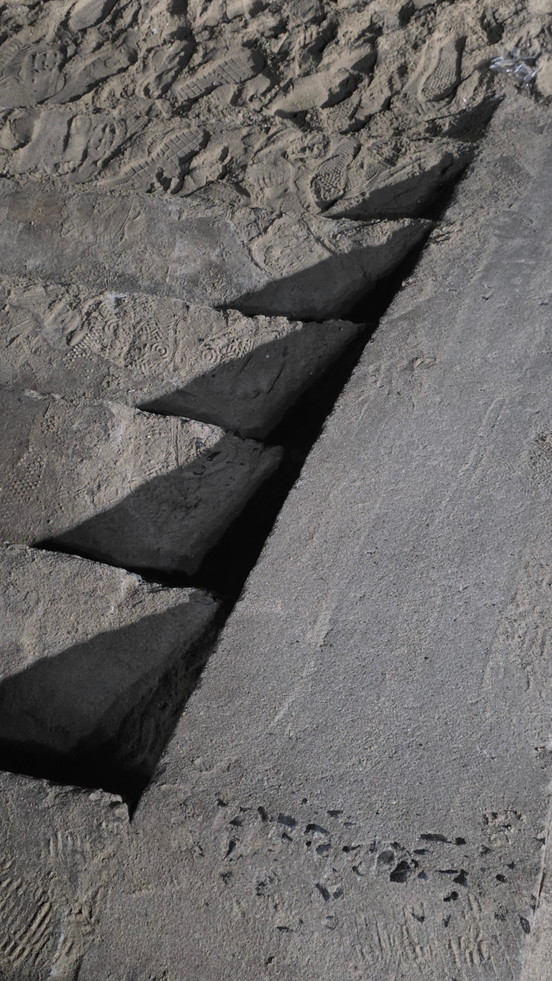 The image presents an angled, close-up view of a rugged, grey-toned environment, possibly in Nha Trang, Vietnam. A large, flat, concrete or stone slab occupies the upper and right sections, displaying…read more
