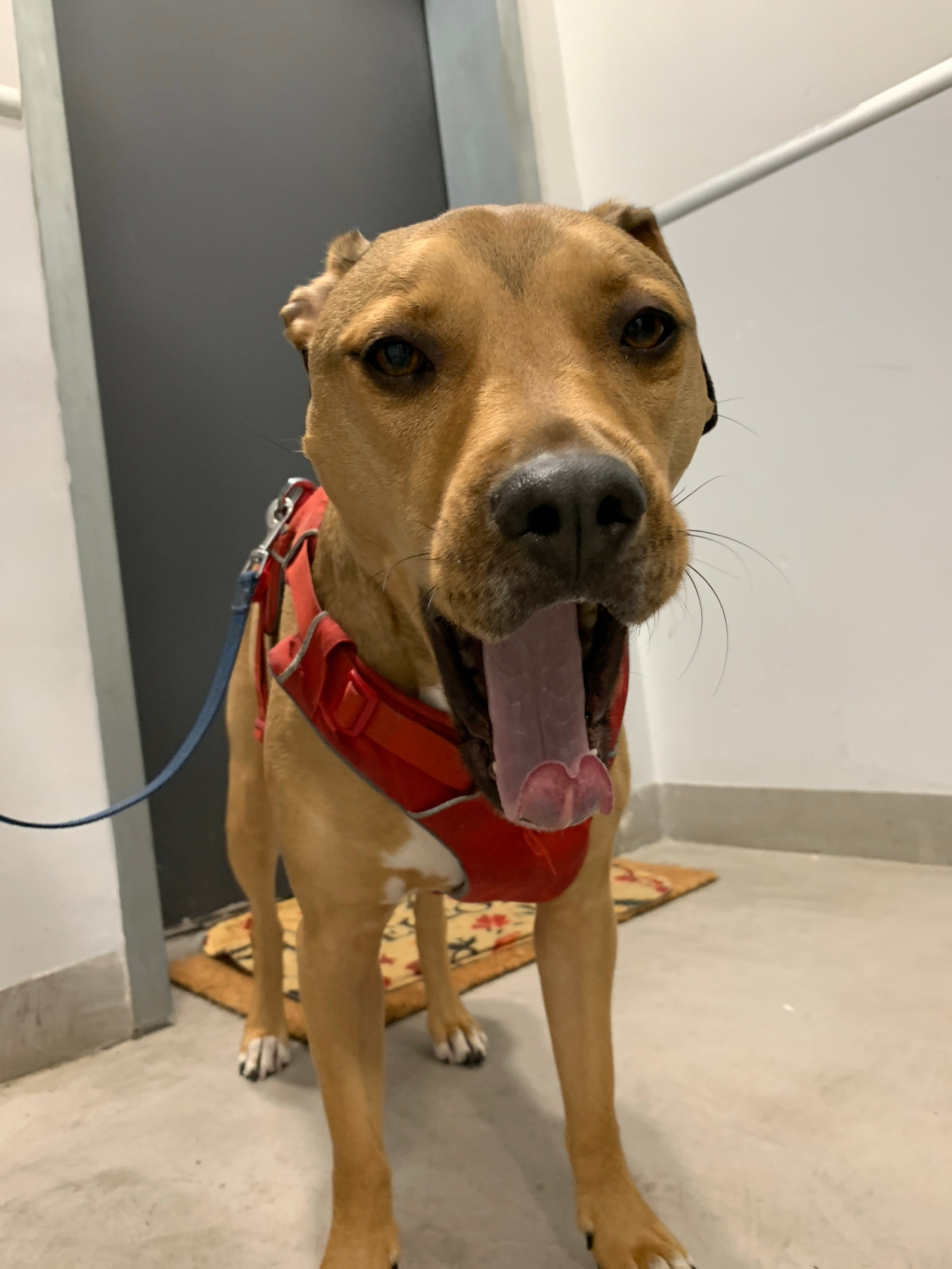 A medium-sized, tan-colored dog is indoors, wearing a red harness and a blue leash. The dog's mouth is open with its tongue visible. The environment appears to be a hallway or entrance area with a bei…read more