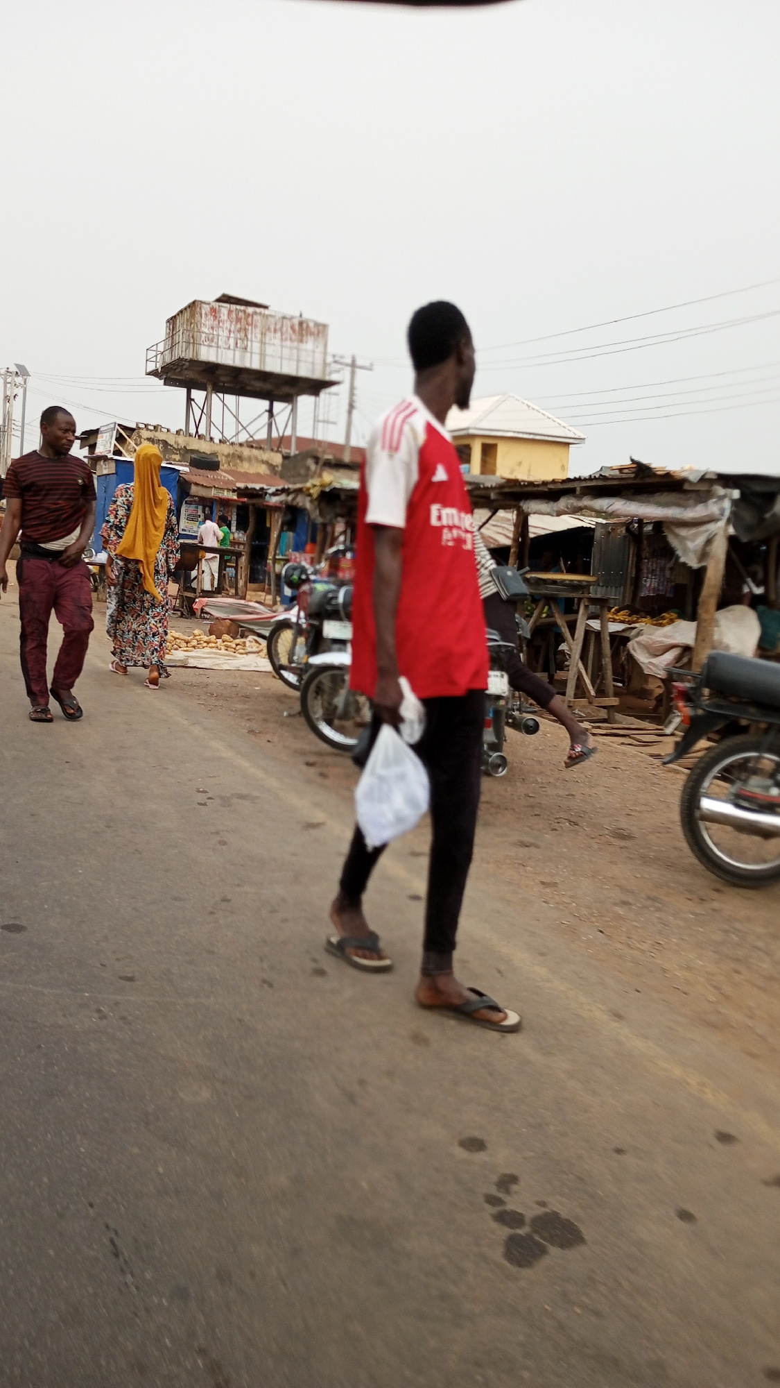 The scene is a street in Adankolo, Nigeria. A man in a red and white shirt, black pants, and sandals is walking away from the camera, holding a white plastic bag. Two other people are walking in the o…read more