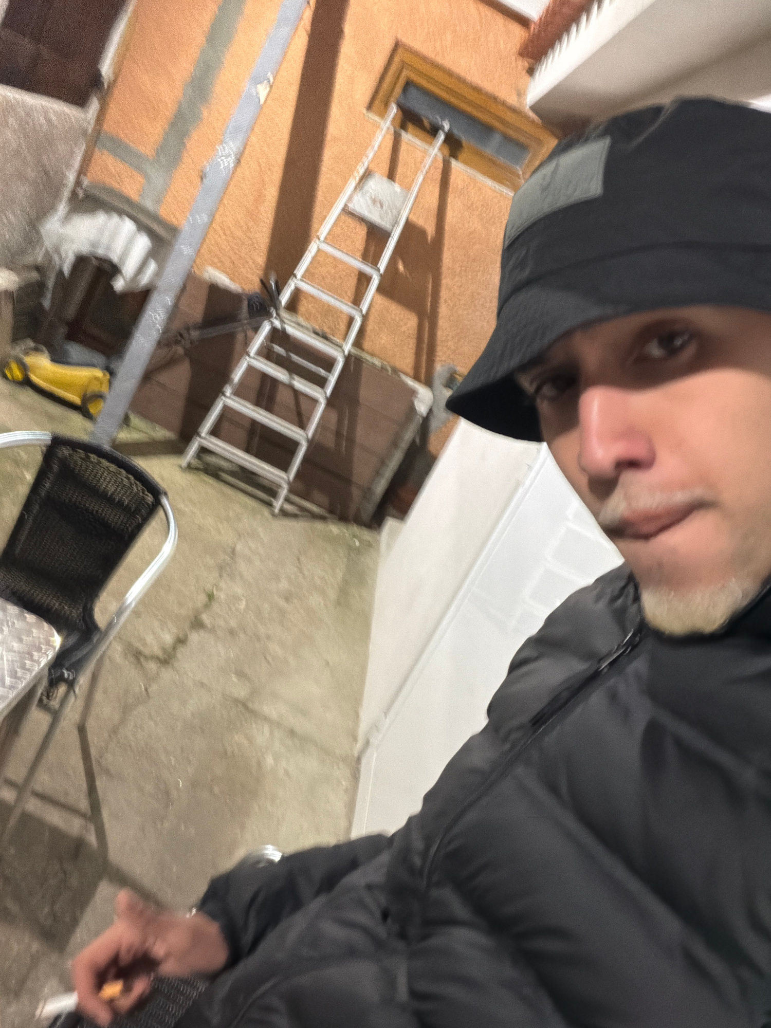 The image depicts a person in a black puffer jacket and a black hat, possibly a beanie, holding what appears to be a cigarette in their right hand. The background shows the exterior of a building with…read more