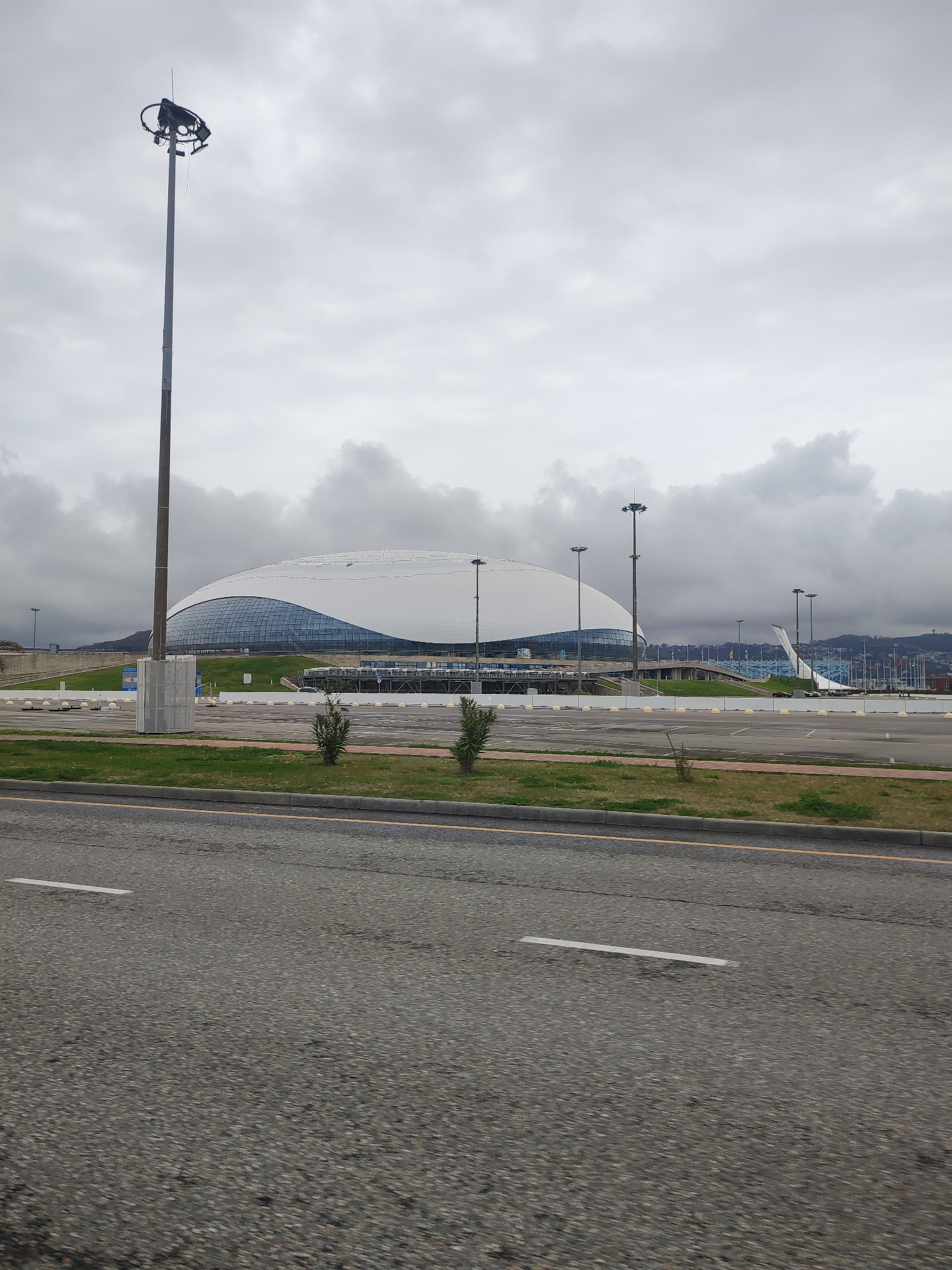 The image depicts the Fisht Olympic Stadium in Sirius, Russia, under a cloudy sky. The stadium, characterized by its white, shell-like structure and blue-tinted glass façade, is the focal point. In th…read more