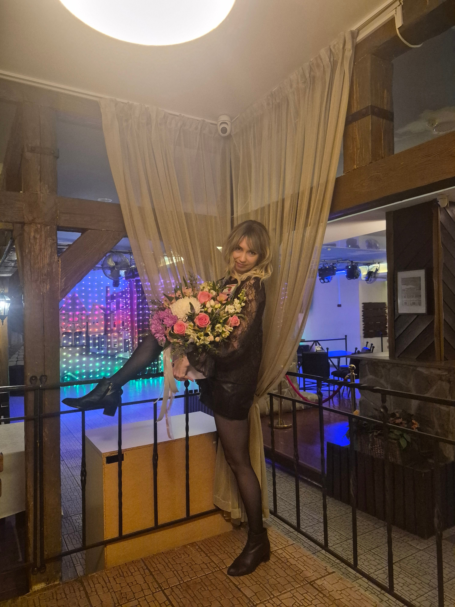 A woman is sitting on a ledge next to a railing in a room with a high ceiling. She is wearing a dark-colored dress, sheer black stockings, and black boots. She is holding a bouquet of flowers. The roo…read more