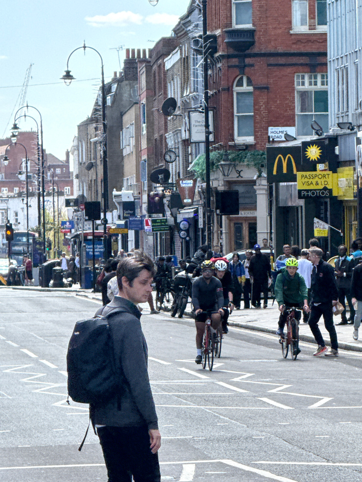 The image depicts a street scene in London, United Kingdom. A man is walking on the right side of the image with buildings behind him and to his left. On the left side of the street, there are numerou…read more