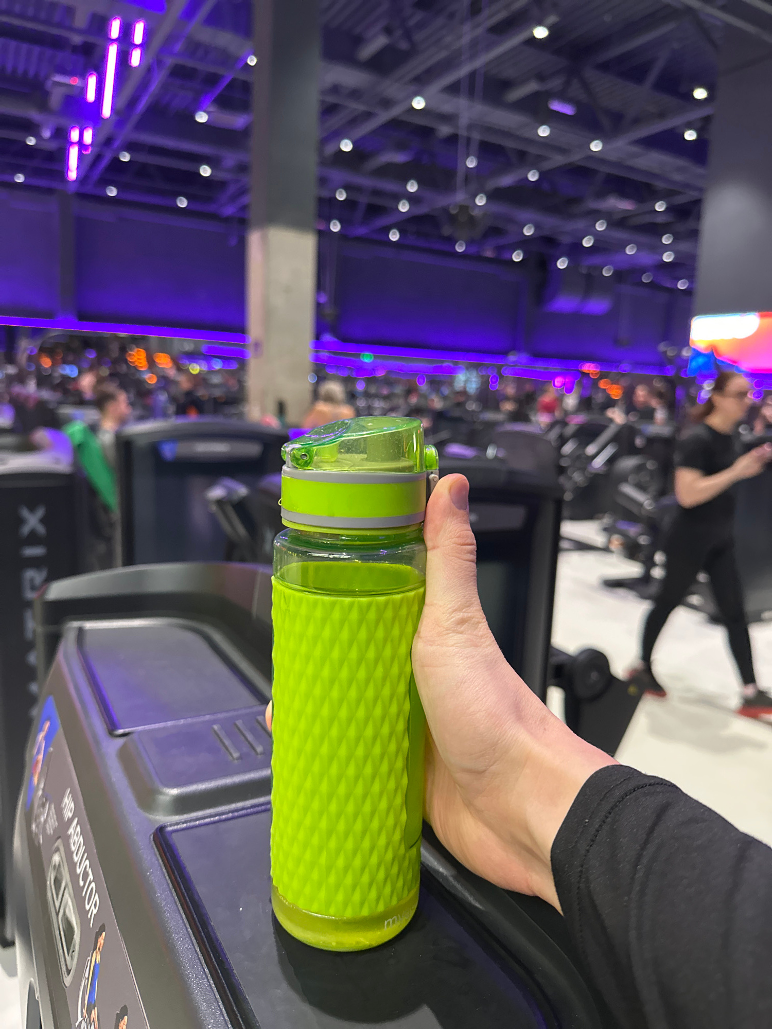 A person is holding a light green water bottle in what appears to be a fitness center. The water bottle is textured and partially open, with a visible water droplet. The person is seated on or near a…read more