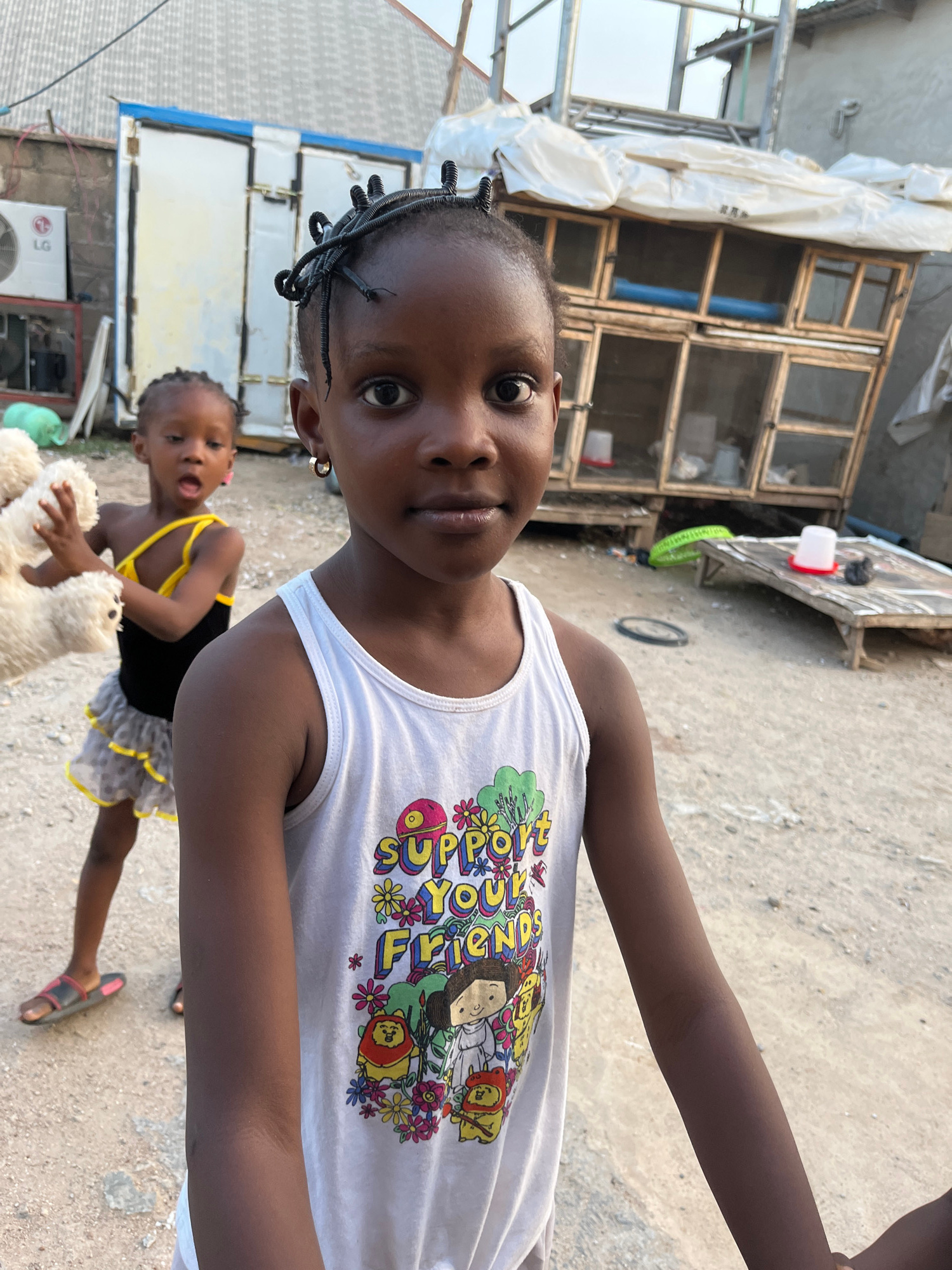 The image depicts two young girls in Madalla, Nigeria. The foreground features a girl with braids, wearing a white tank top with a colorful cartoon print. Behind her, another girl is visible, holdingβ¦read more