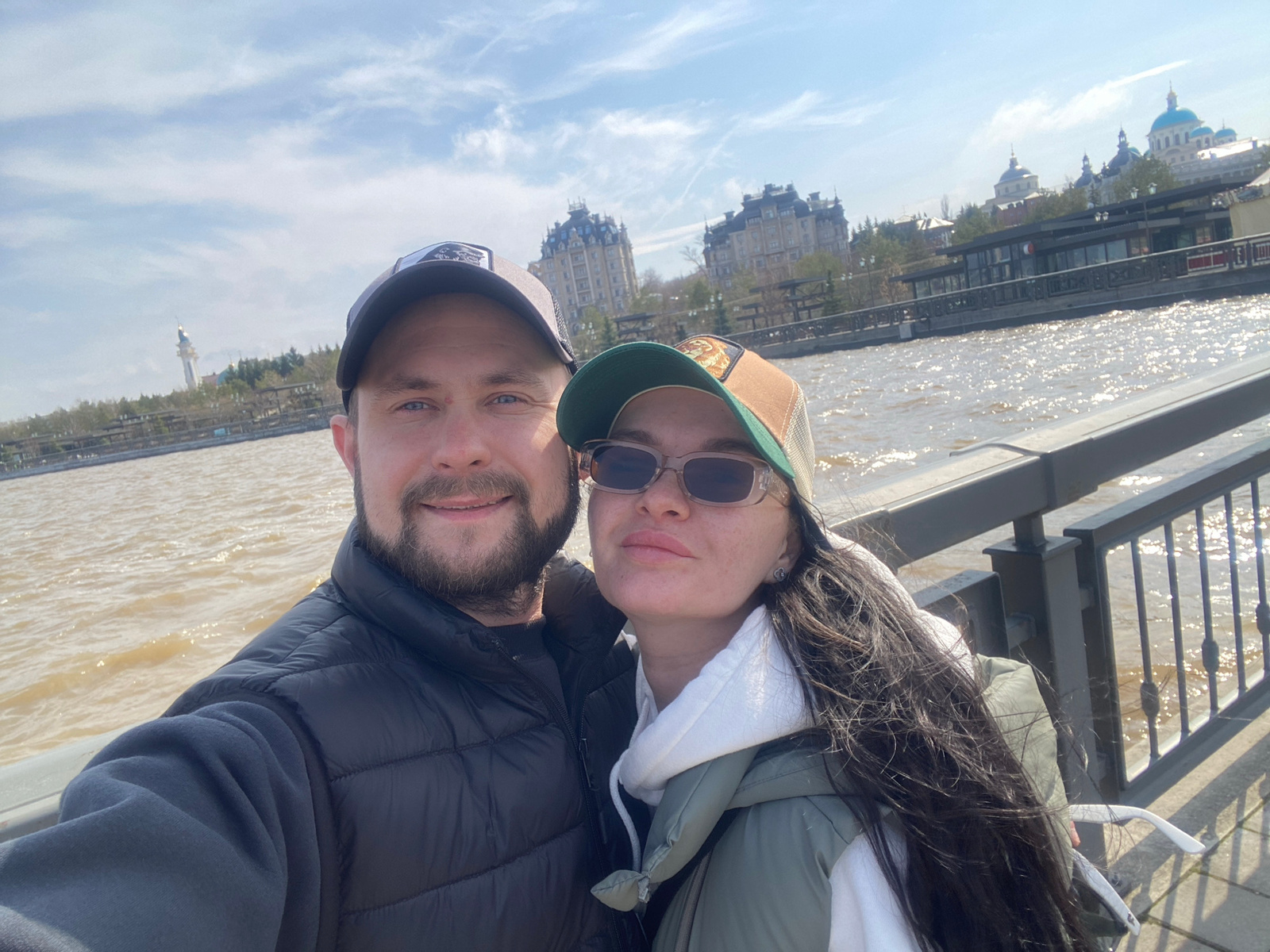 A couple is taking a selfie. The woman is wearing a green and tan baseball cap and sunglasses, while the man is wearing a dark cap and a puffer jacket. They are standing on a bridge or embankment near…read more