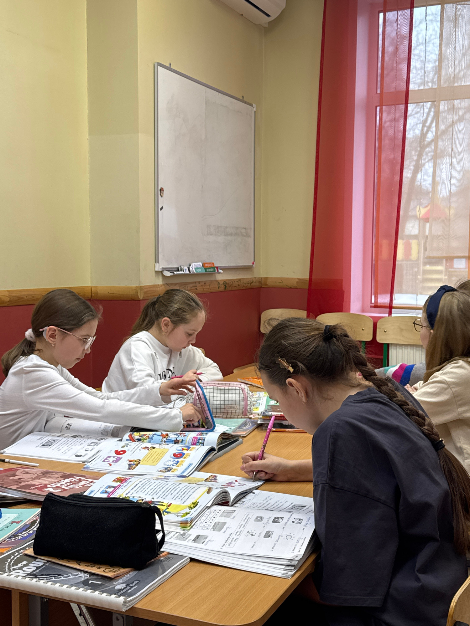 The image captures a scene inside a classroom, likely in Perm, Russia (based on the notebook labeled "Tetrad'" which uses the Russian Cyrillic alphabet). Several young students are seated at desks, ap…read more