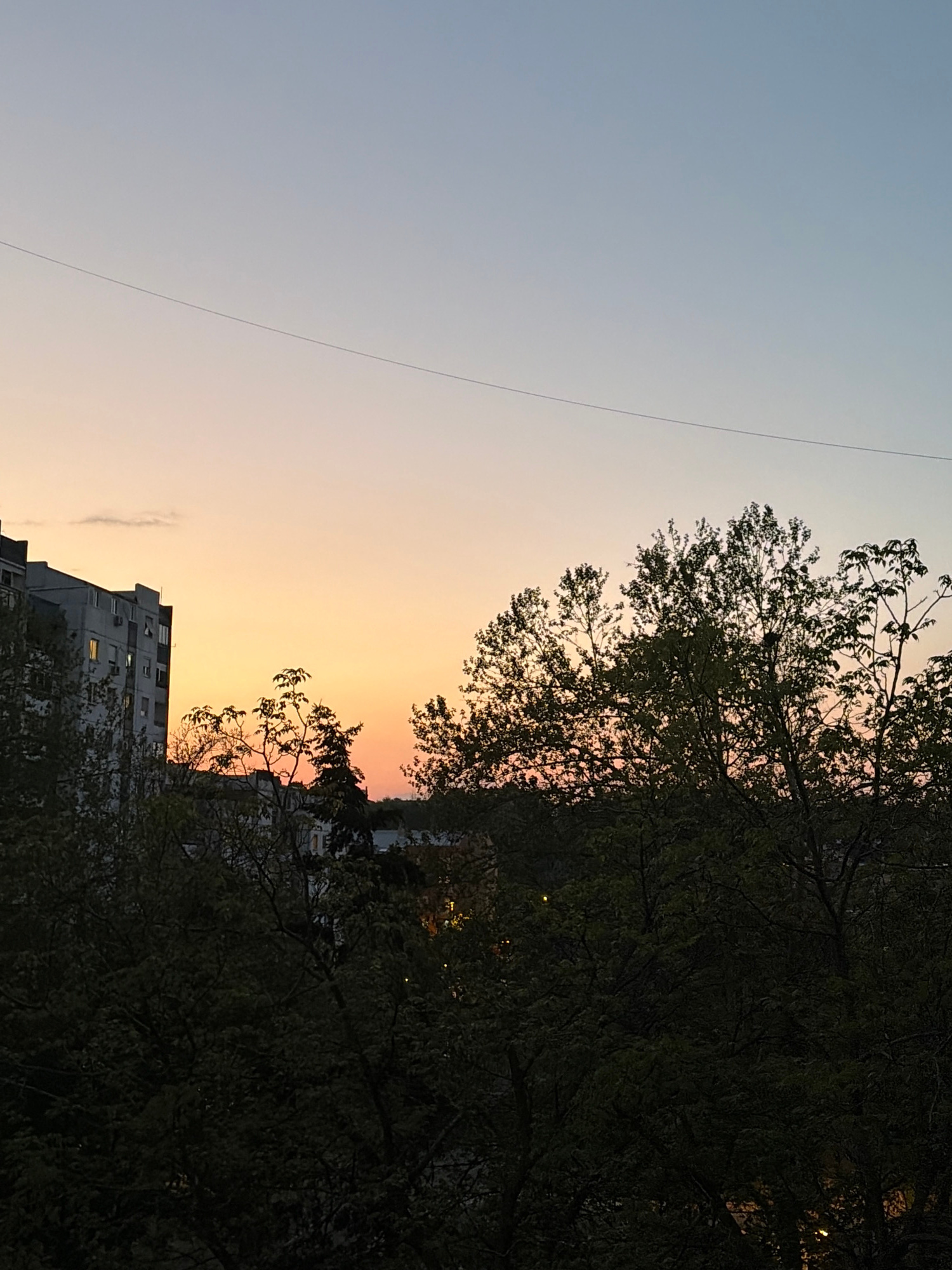 The image shows a view of Belgrade, Serbia at sunset. The sky is a gradient of colors, transitioning from light blue to orange near the horizon. A powerline stretches across the upper left portion ofโฆread more