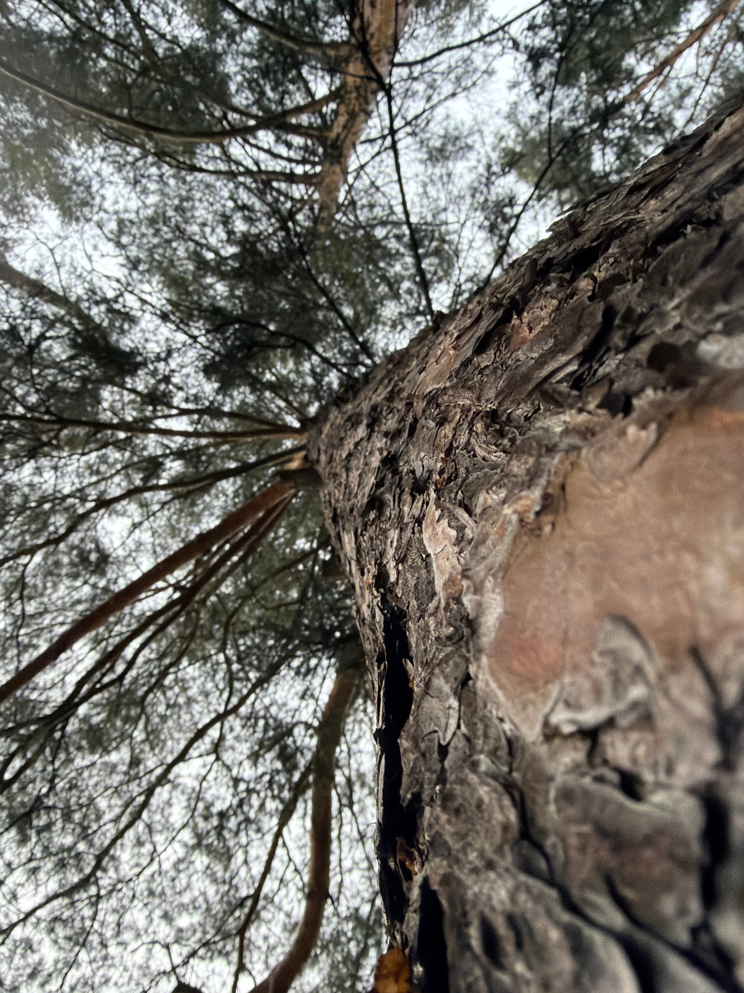 The image shows a low-angle view looking up into a tree canopy. The rough bark of a tree trunk dominates the foreground. Branches extend upwards, forming a dense network against a cloudy, overcast sky…read more