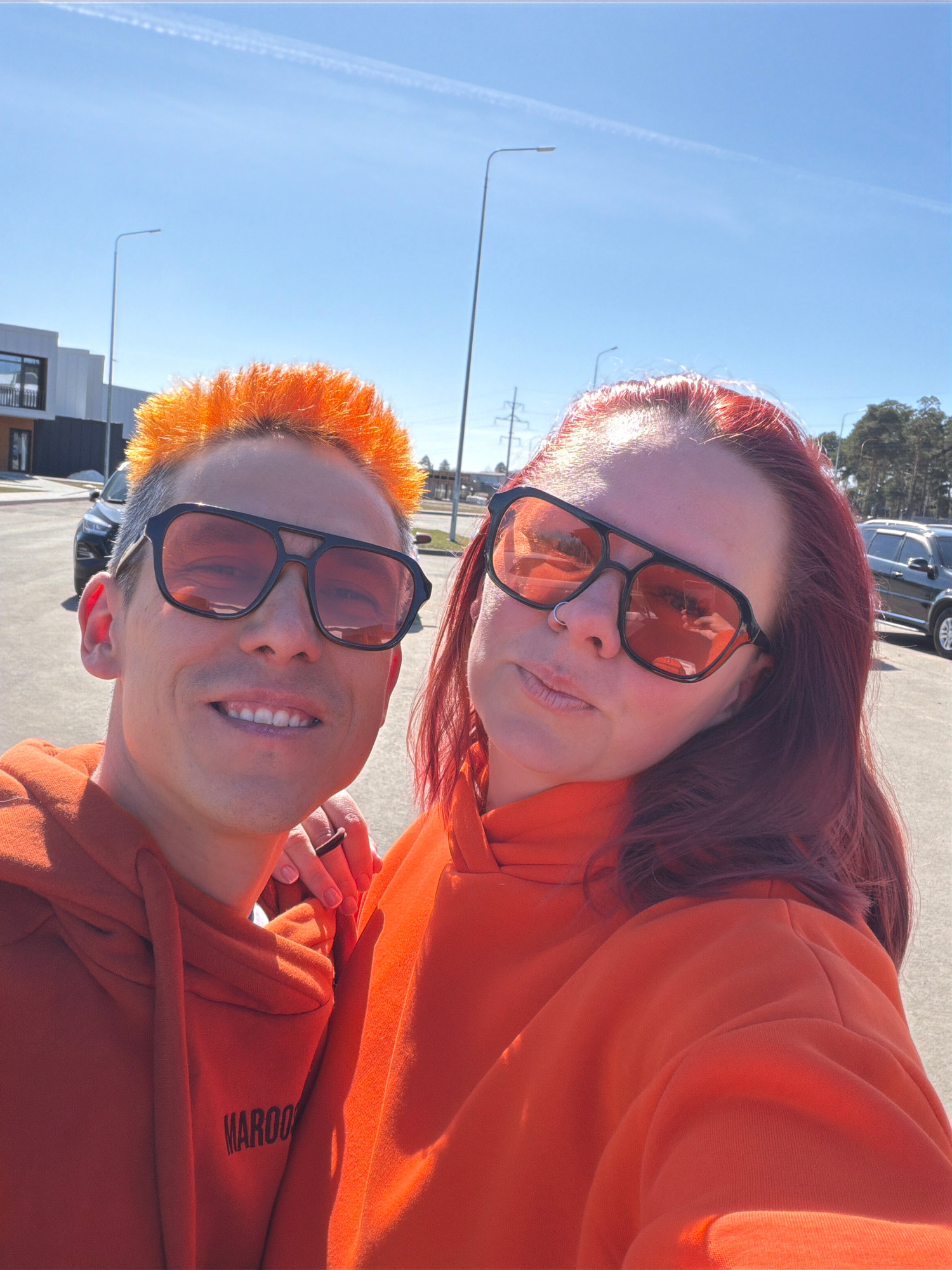 Two individuals are posing for a selfie outdoors. The person in the lower part of the frame has short, bright orange hair and is wearing sunglasses. The person above them has reddish-purple hair and i…read more