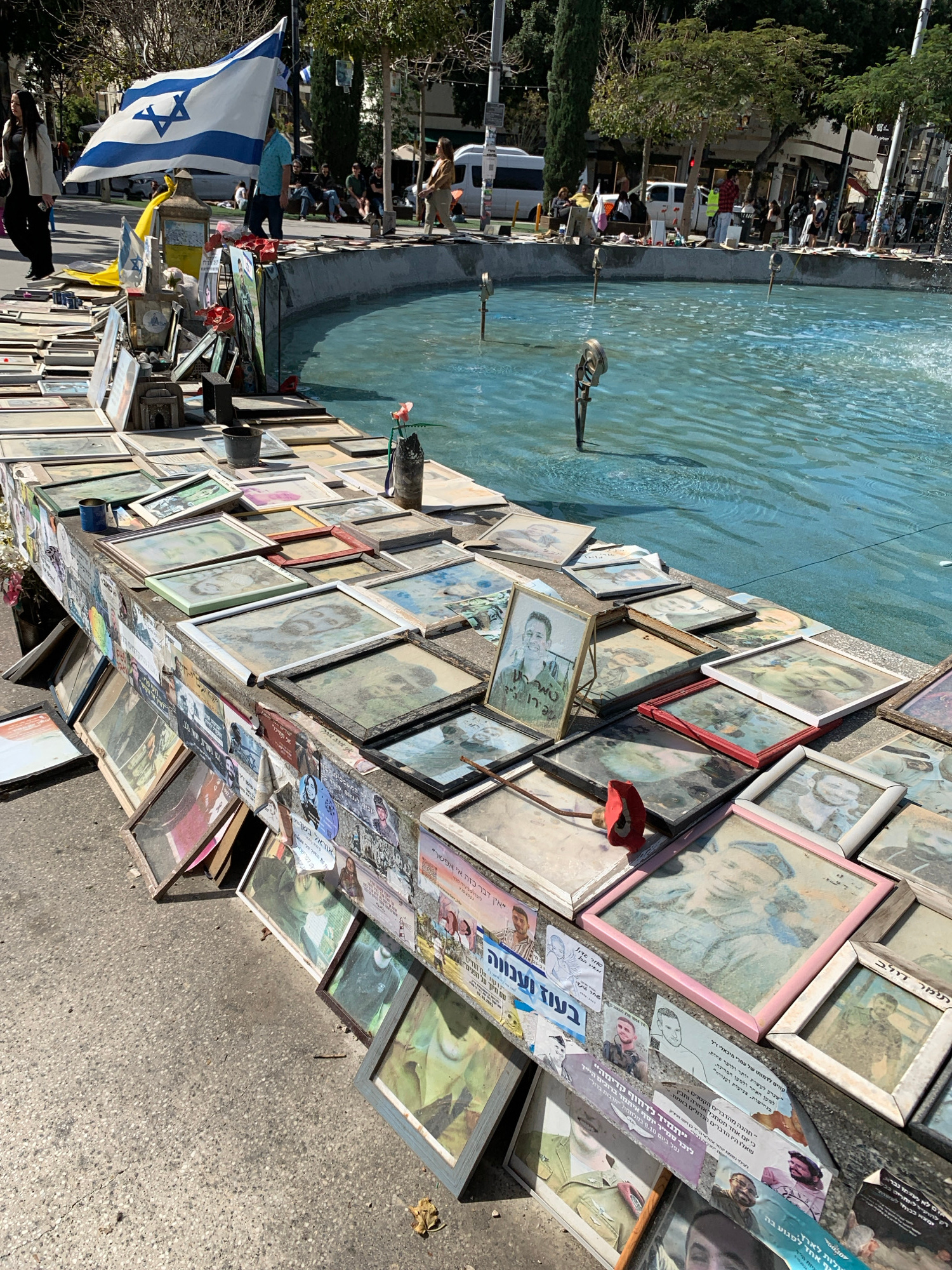 The image shows a memorial display along the edge of a water feature, likely a fountain, in Tel Aviv, Israel. The display consists of numerous framed photographs, mostly portraits, placed on the pavem…read more
