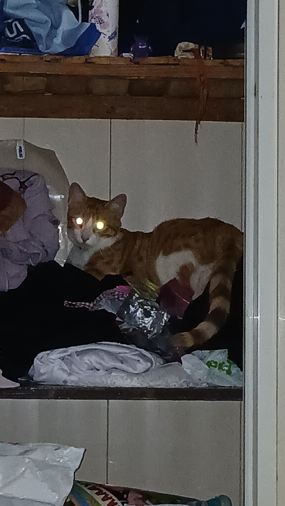 An orange and white striped cat is inside a partially open closet in Altagracia, Venezuela. The closet's contents include clothing and plastic bags. The cat's eyes are reflecting light. The closet app…read more