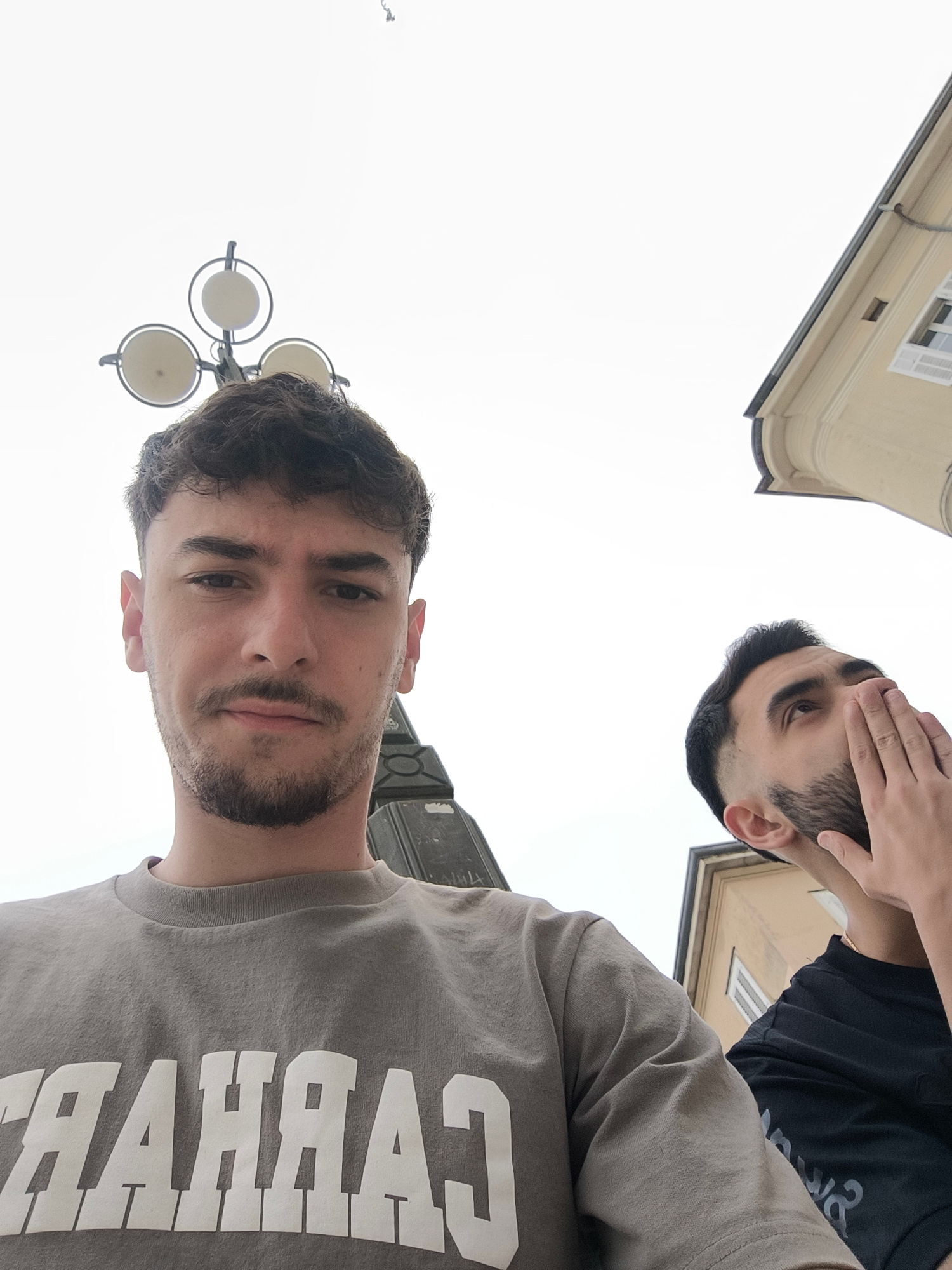 A low-angle, outdoor selfie shows two young men against an overcast sky. The man in the foreground is wearing a grey t-shirt with the word "CARHARTT" printed on it. He has short, dark hair and a groomβ¦read more