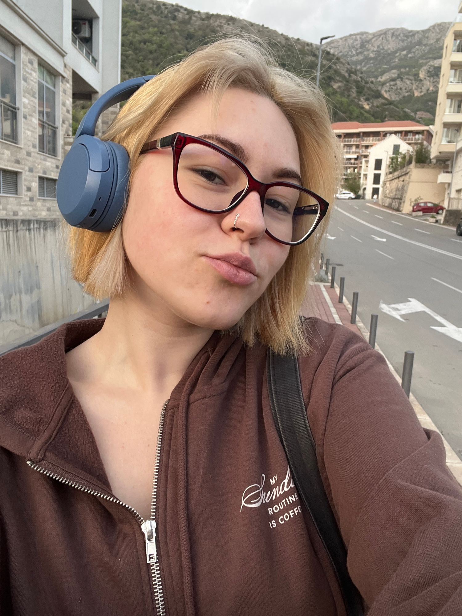 A young woman with blonde hair and glasses is taking a selfie outdoors. She is wearing a brown zip-up hoodie and blue headphones. In the background, there is a street with buildings and a mountain. Ba…read more