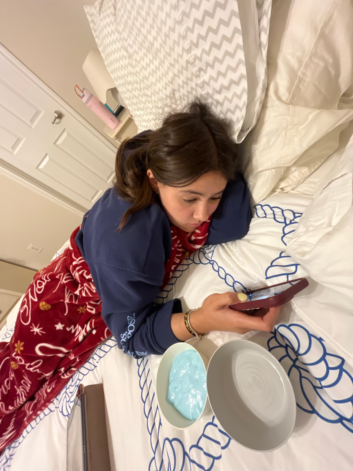 A medium shot shows a woman lying on her back on a bed, using a mobile phone. The bedding consists of white sheets with a blue rope-like pattern, a pillow with a gray chevron pattern, and a red blanke…read more
