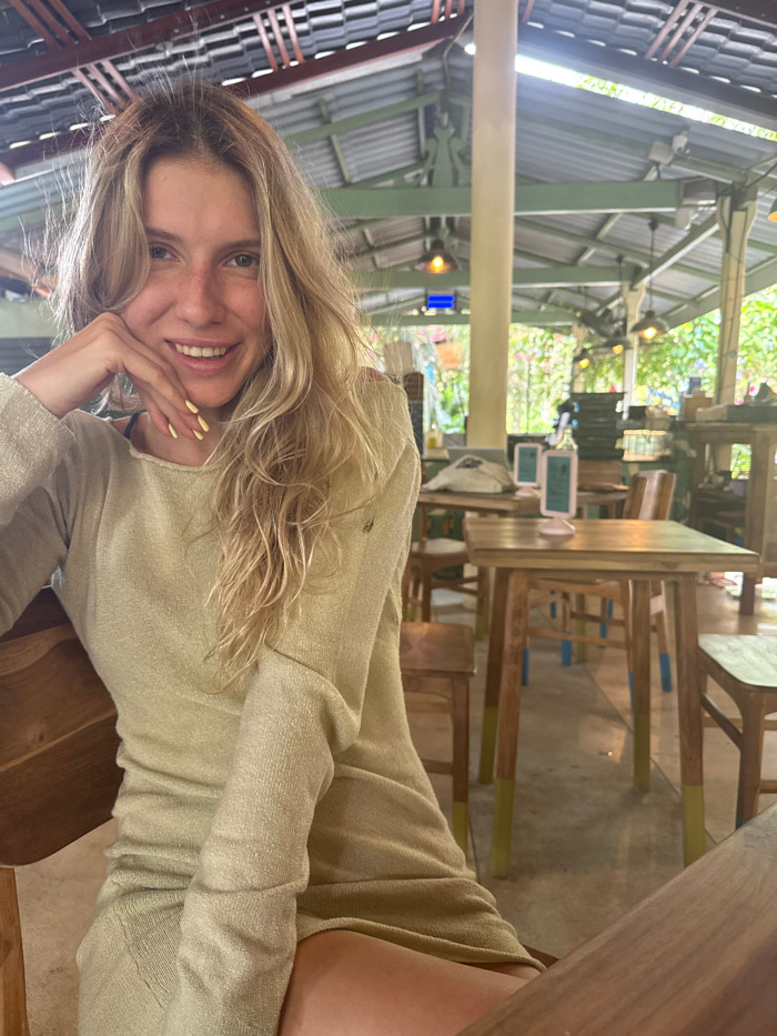 A blonde woman in a long-sleeved beige dress smiles, resting her head on her hand. She's seated at a wooden table, with more tables and chairs visible in the background. The setting appears to be an o…read more