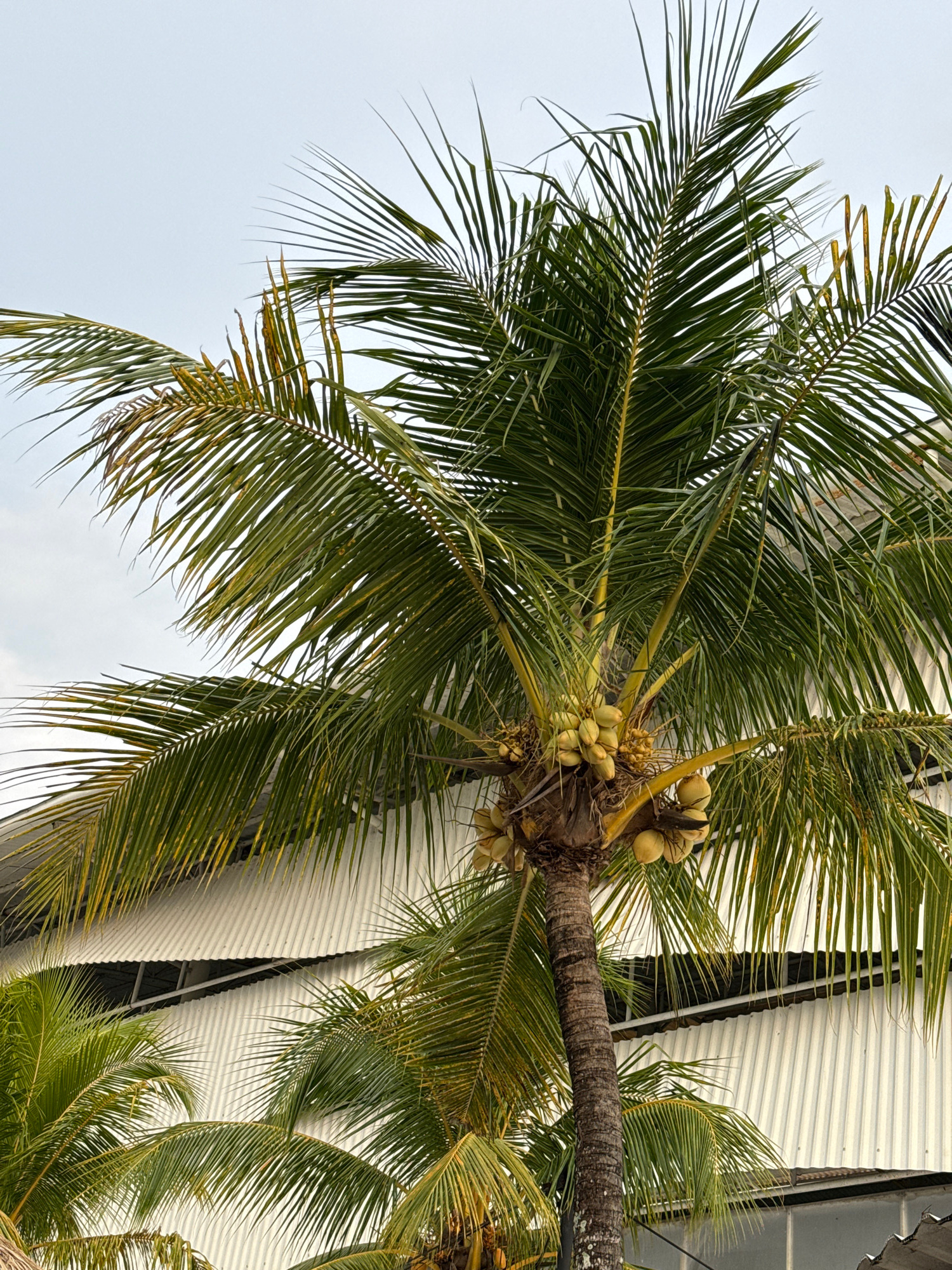 The image captures a palm tree laden with coconuts in Canggu, Indonesia. The palm's trunk is visible, branching out into numerous green fronds. Several clusters of green coconuts are attached to the t…read more