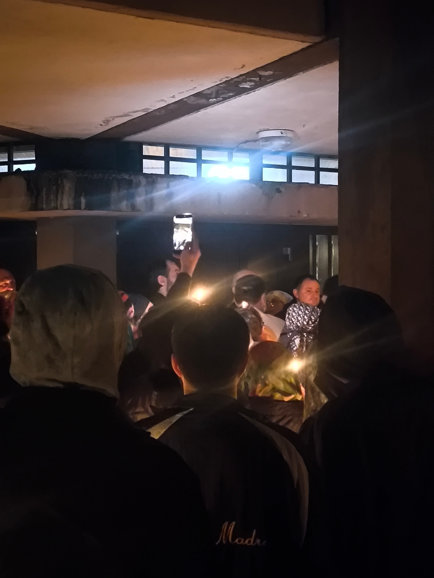 The image shows a gathering of people holding candles, likely at night, under an overhang with a ceiling and light fixture. There are windows visible in the background. One person is holding up a cell…read more