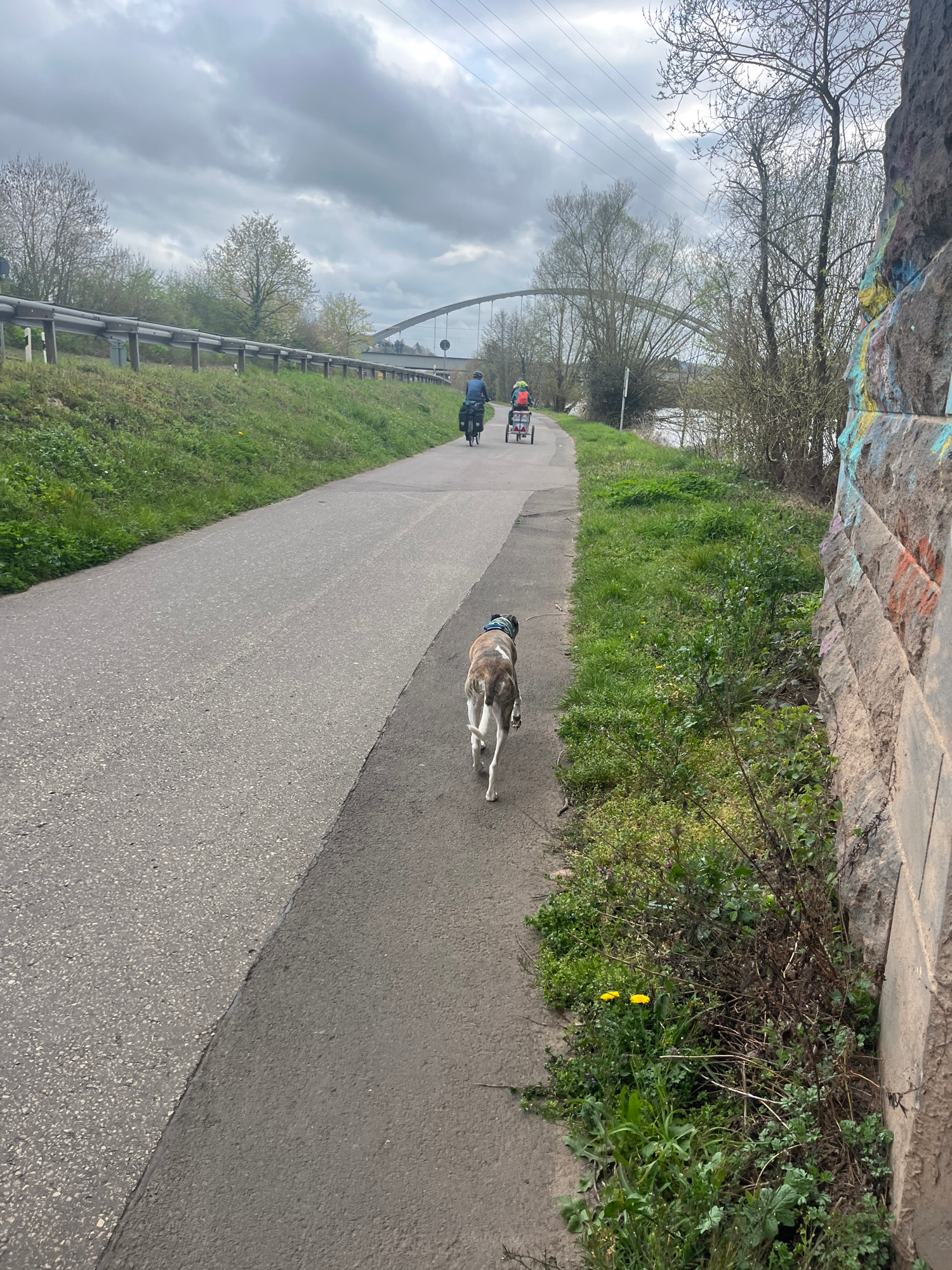 A grey paved path curves away from the viewer. A dog with a blue collar is walking on the path, facing away from the viewer. Two cyclists are further up the path, also facing away. The path is bordere…read more