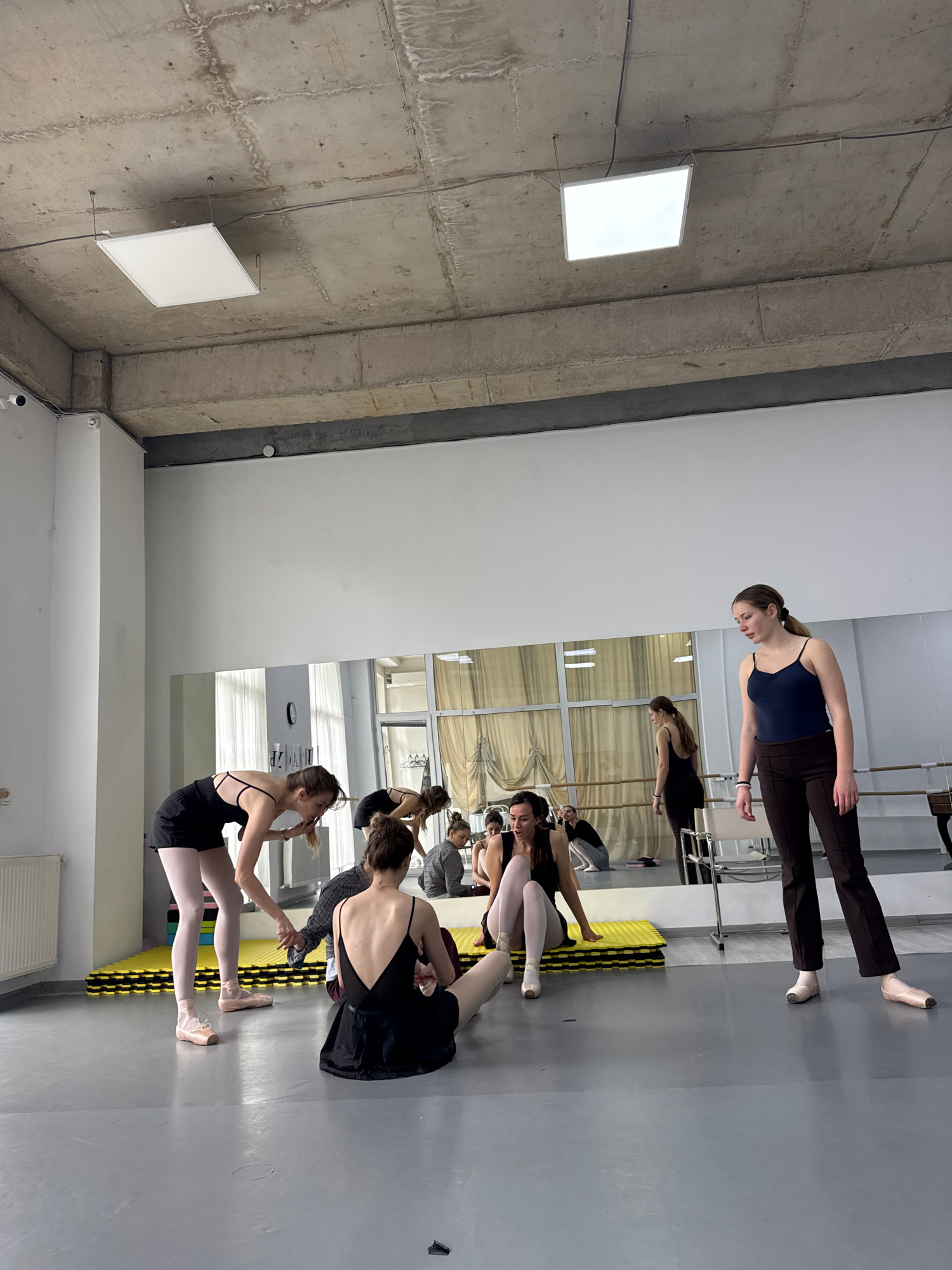 The image captures an indoor ballet studio, likely located in Tbilisi, Georgia. Several young women, presumably dancers, are visible, engaged in a practice or training session. In the foreground, one…read more