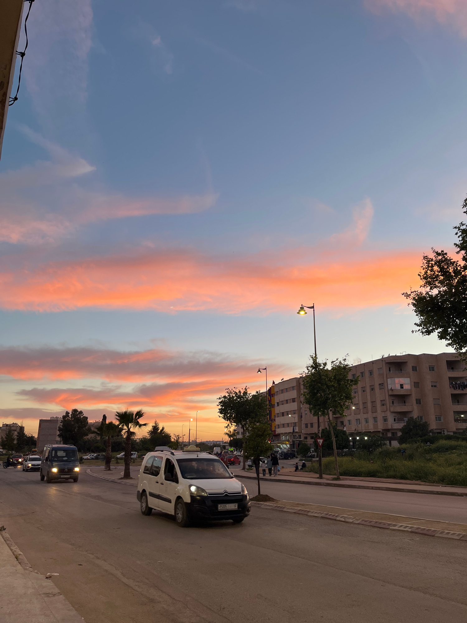The media file presents an urban street scene during sunset or dusk, with the image rotated 90 degrees clockwise, placing the dramatic sky on the left and the street on the right. The left half of the…read more