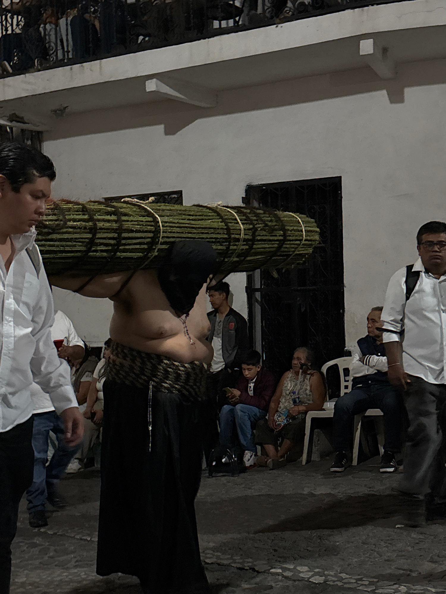 In Taxco, Mexico, a man, partially unclothed and carrying a large bundled stick cross, stands near a wall. People sit and stand nearby, observing. The setting appears to be outdoors at night.