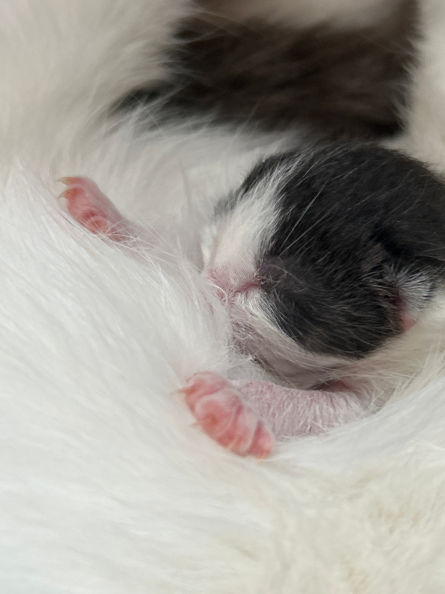 A newborn kitten, primarily black and white, is nestled in the white fur of what appears to be its mother. The kitten's eyes are closed and its pink paws are visible. The environment is close and inti…read more