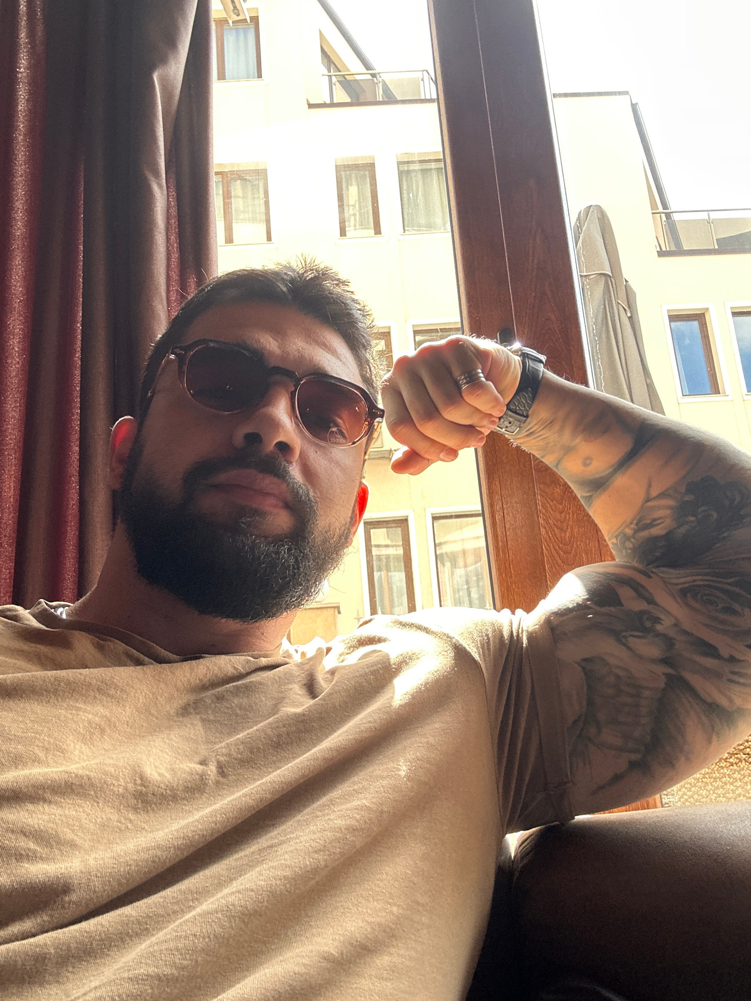 The image shows a man with a beard and sunglasses, positioned at an unusual angle, likely a selfie. He wears a tan-colored shirt and has a heavily tattooed arm. He wears a watch and a ring on his hand…read more