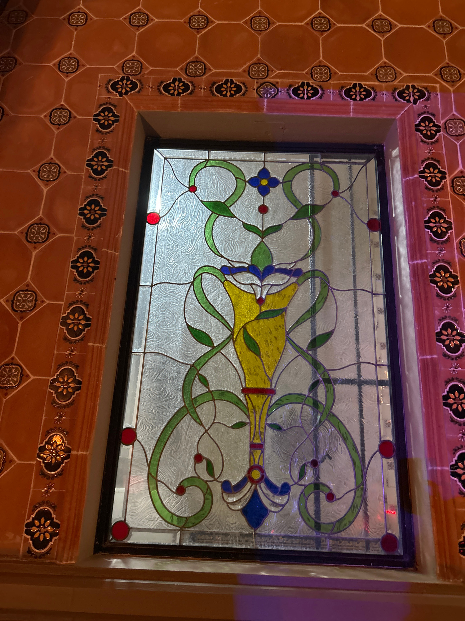 A stained-glass window is surrounded by terracotta-colored square tiles, some decorated with a stylized flower design, and detailed borders with alternating light and dark floral motifs. The window it…read more