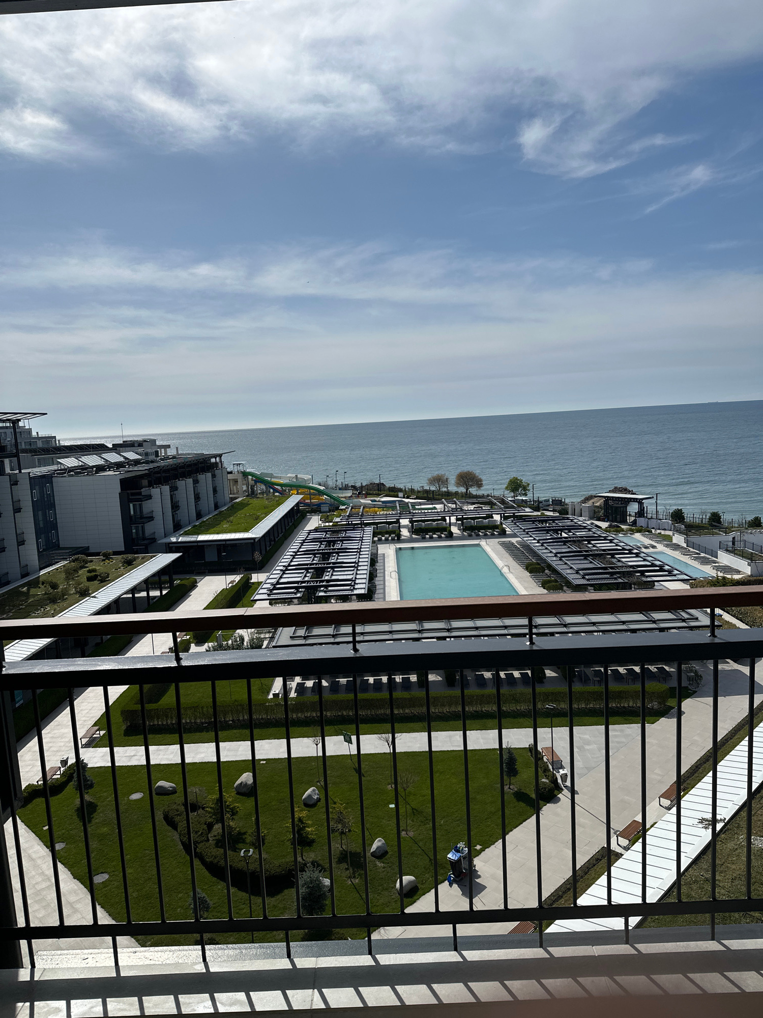 The image presents an elevated, panoramic view from a balcony overlooking a modern coastal resort complex in Sveti Vlas, Bulgaria. The horizon is level, with a vast, calm expanse of blue-grey sea stre…read more