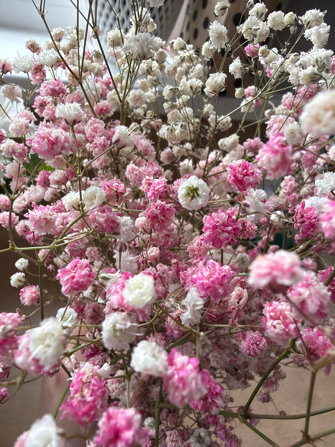 This is a close-up, high-angle shot showcasing a dense arrangement of small, delicate flowers, resembling Baby's Breath (Gypsophila). The primary colors of the flowers are white and various shades of…read more