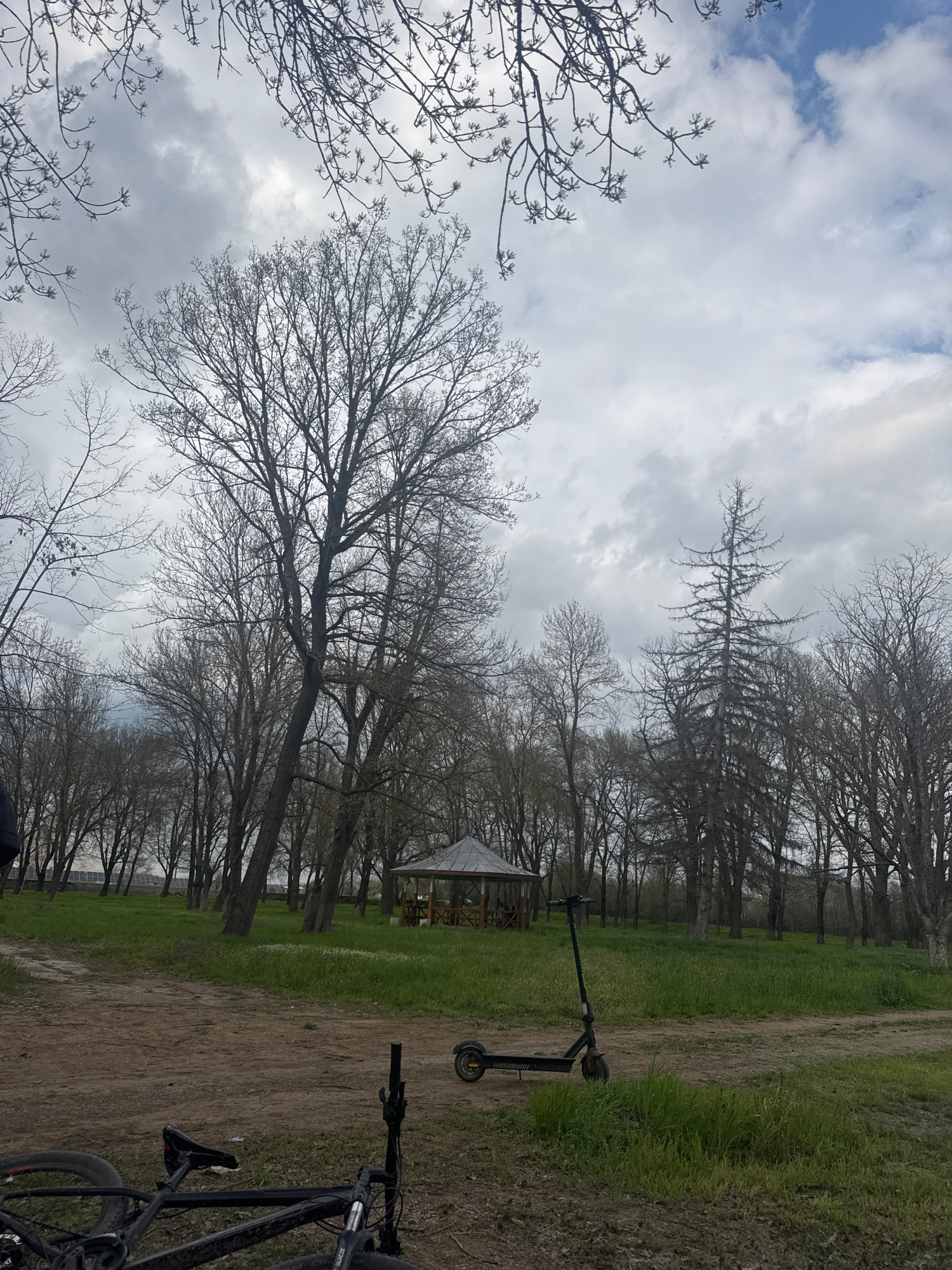 The image shows a park landscape, possibly in Lehchevo, Bulgaria. A dirt path runs along the right side of the image, with green grass bordering it. Several leafless trees line the path, stretching in…read more
