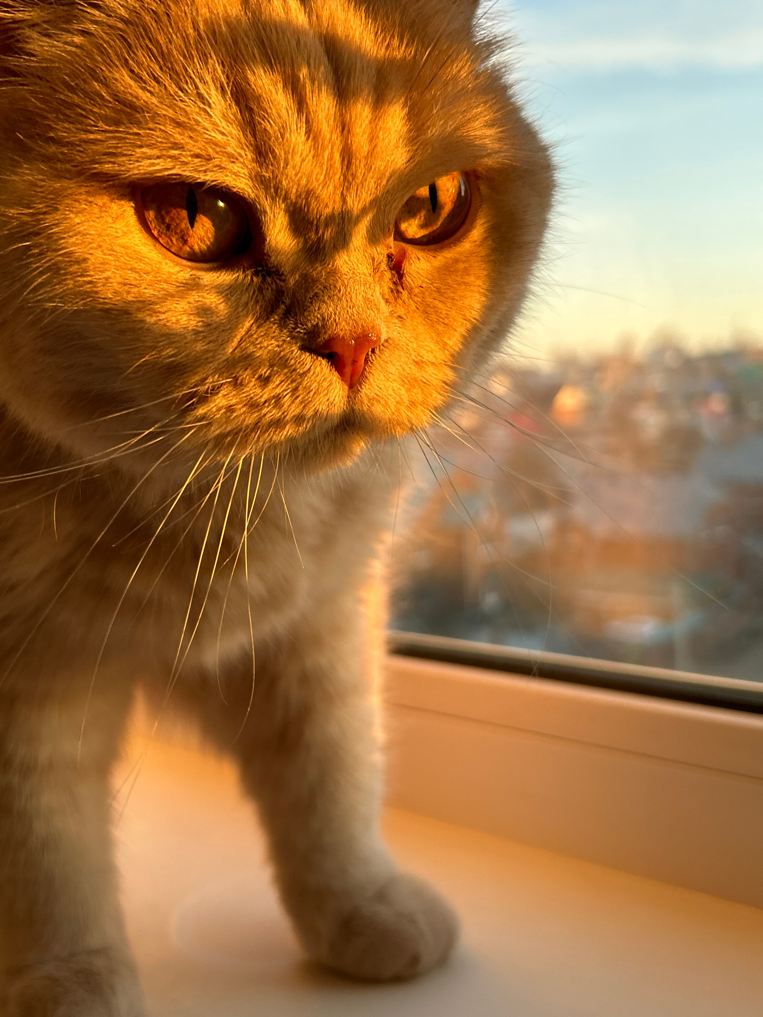 A close-up, horizontal photograph captures a fluffy, ginger and cream-colored cat reclining on a white window sill, bathed in warm, golden light. The cat is positioned at a low angle, gazing slightly…read more