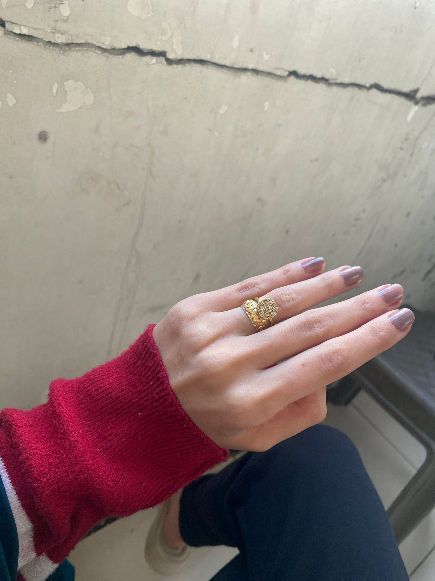A high-angle shot displays a person's left hand adorned with two gold rings on the ring finger. The rings feature intricate designs and are placed on the ring finger of the hand. The fingernails are p…read more