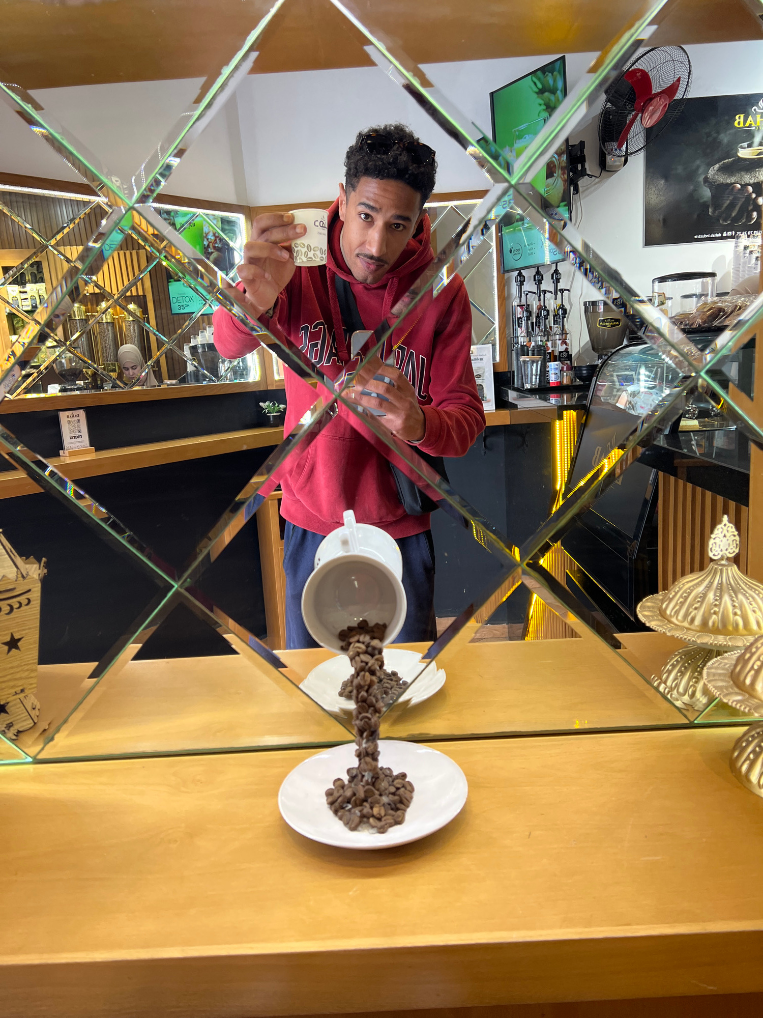 The image depicts the interior of a modern coffee shop in Tanger, Morocco, viewed through a decorative wall composed of diamond-shaped mirror tiles. In the foreground, on a light wooden counter, a whi…read more