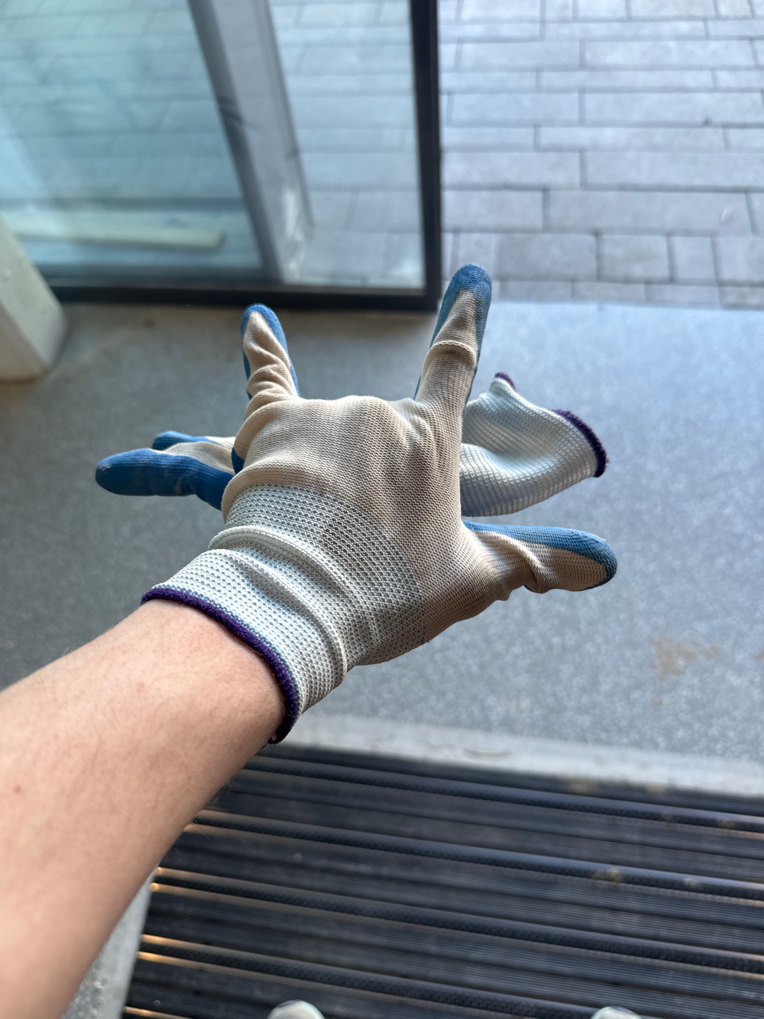 A gloved hand is held up in front of a building or interior with gray walls. The glove is white with blue fingertips and trim. The hand is extended in a gesture, with the middle and ring fingers bent…read more