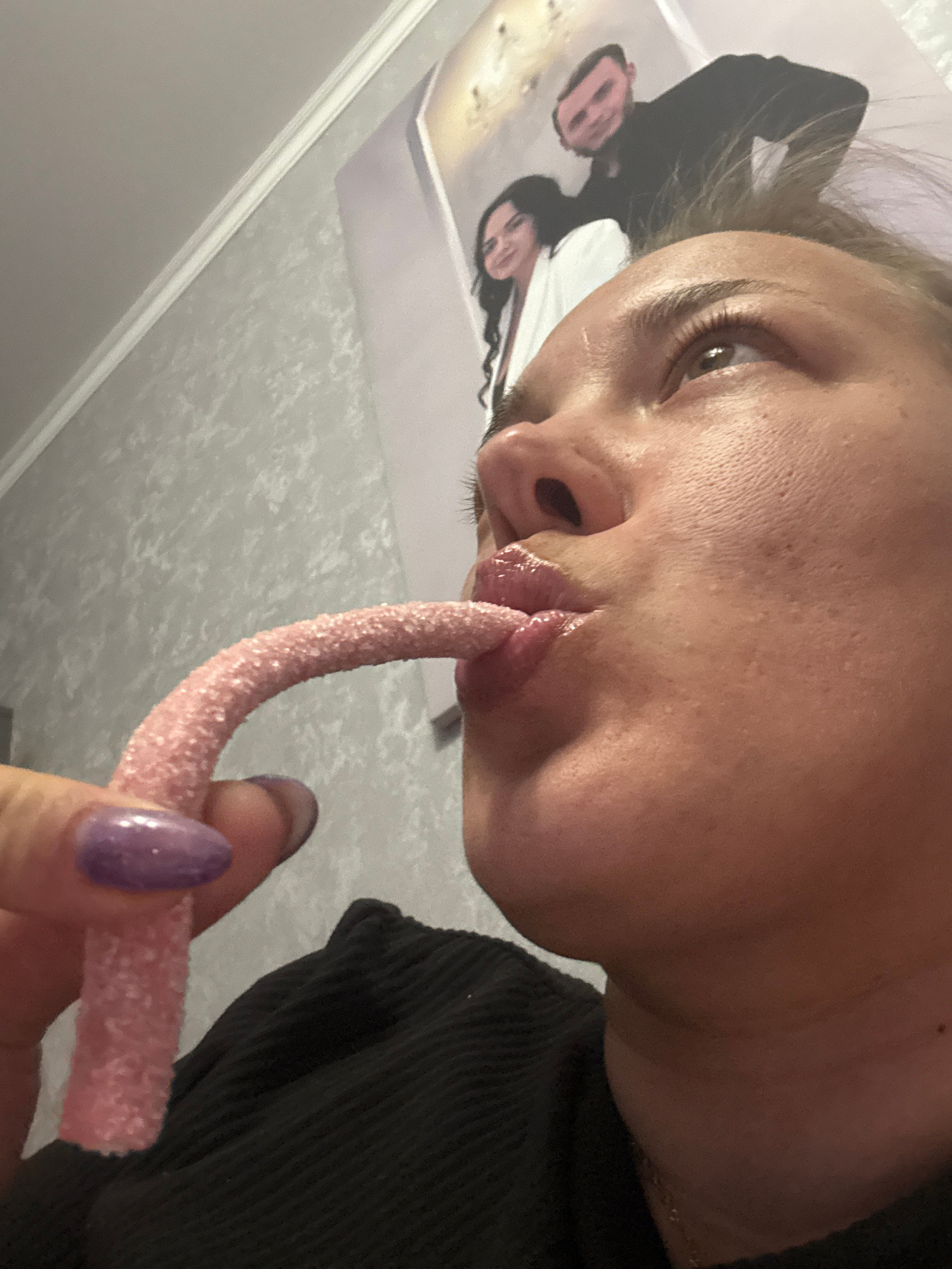 The image shows a close-up, tilted perspective of a person holding a pink, sugar-coated candy near their mouth. The person has fair skin, visible pores, and is wearing a dark-colored garment. Their fi…read more