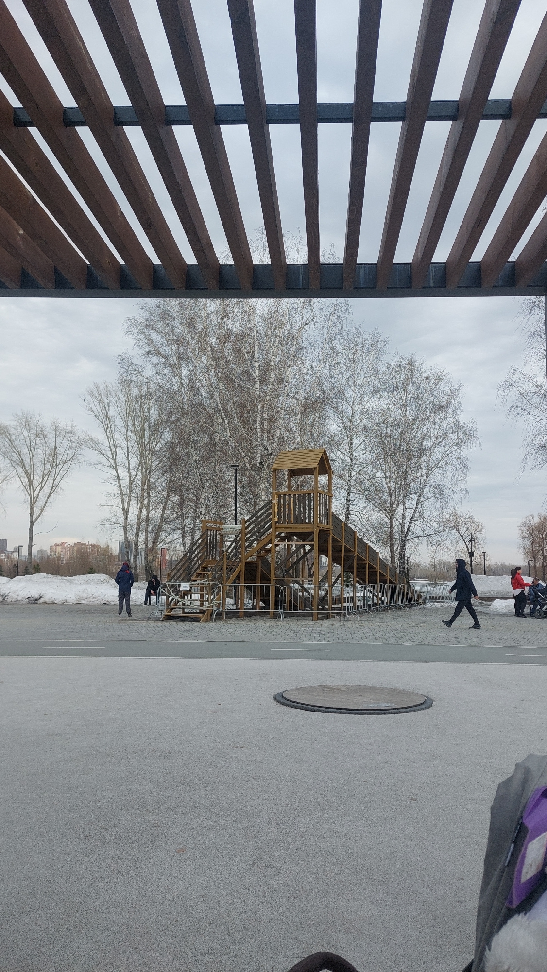 The photograph was taken in Novosibirsk, Russia, and shows an outdoor space, likely a playground or park. A tall, wooden climbing structure with multiple levels and staircases stands in the middle. Ba…read more