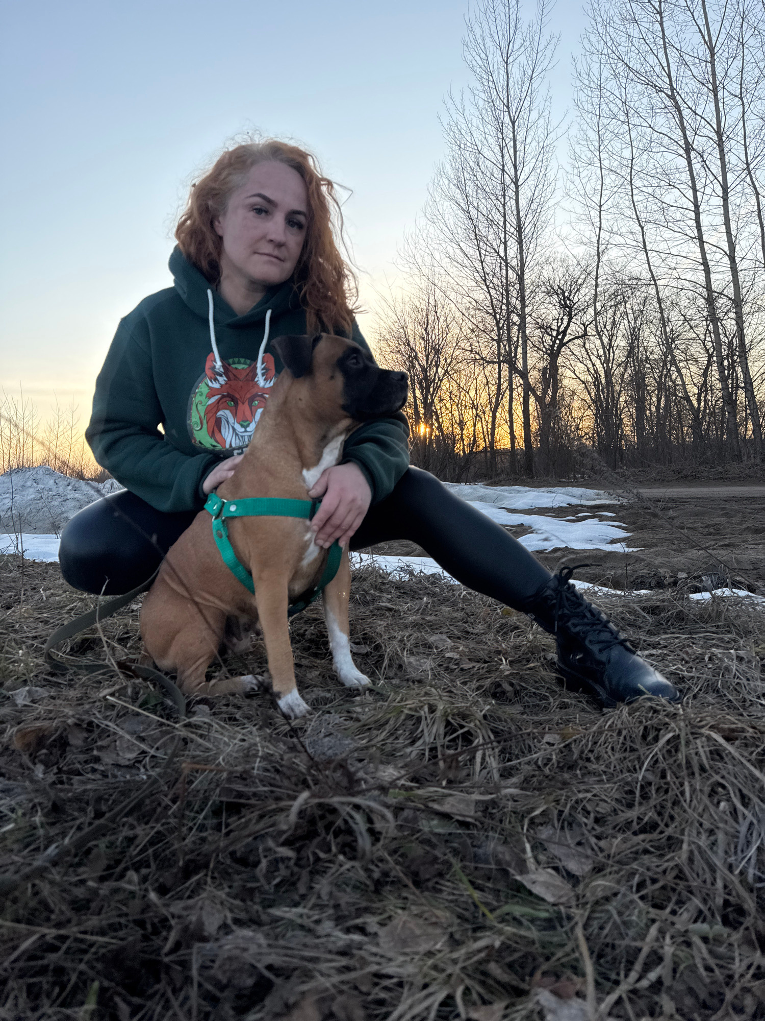 A young woman with auburn hair is hugging a tan and black dog wearing a green harness outdoors. The woman is wearing a dark green hooded sweatshirt with a graphic on the front and black leggings and b…read more