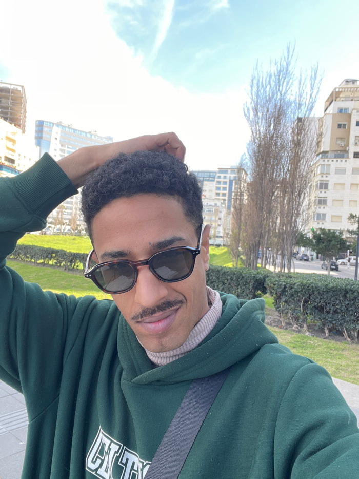 A male individual with medium-brown skin, dark curly hair, and a mustache poses for a selfie outdoors in Tangier, Morocco. He wears dark tortoiseshell sunglasses, a dark green hooded sweatshirt with aβ¦read more