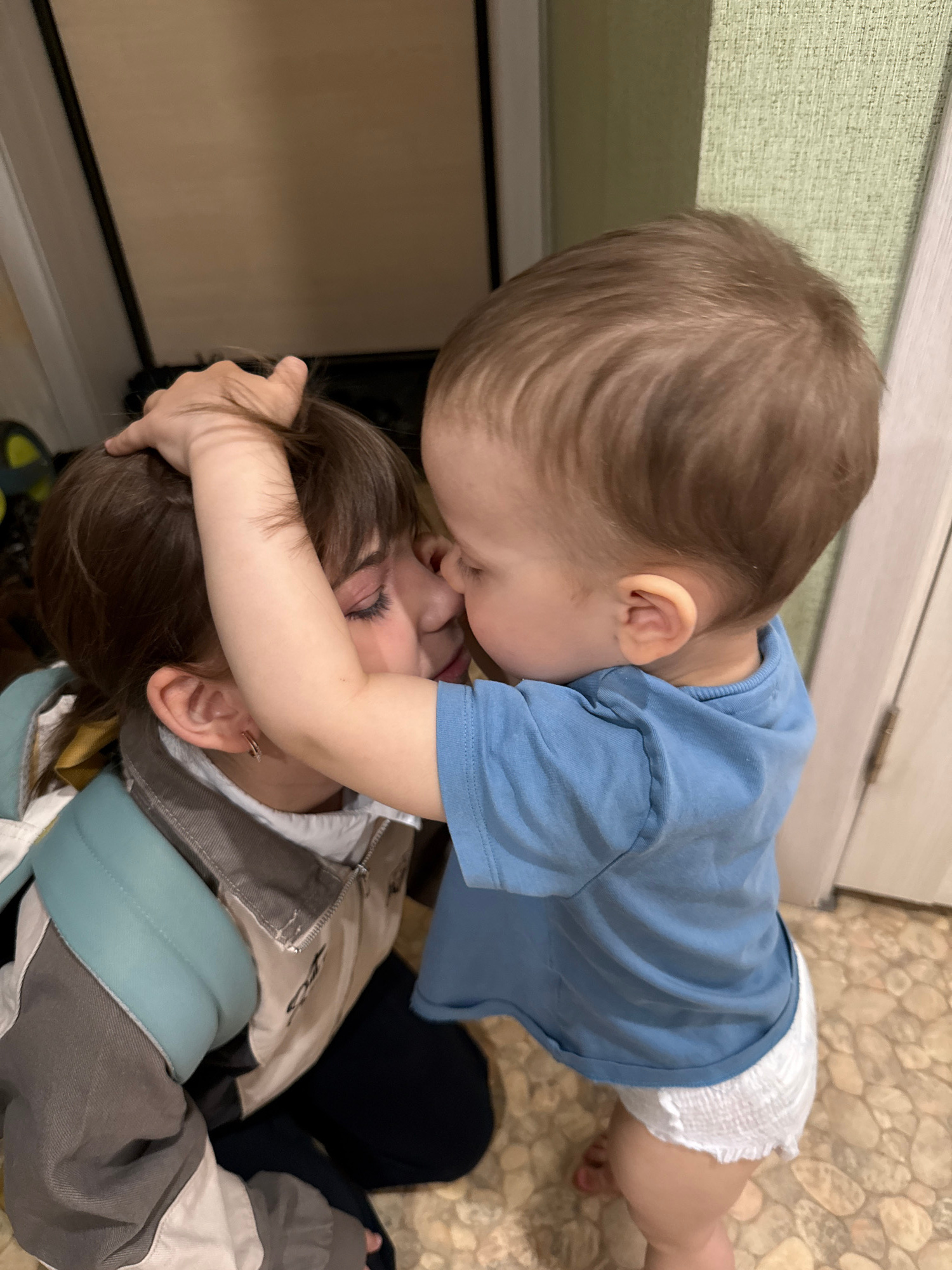 A young child in a blue shirt and diaper leans over and appears to be kissing a person who is lying down. The person is wearing a multi-colored jacket and has dark hair. The scene takes place indoors,…read more